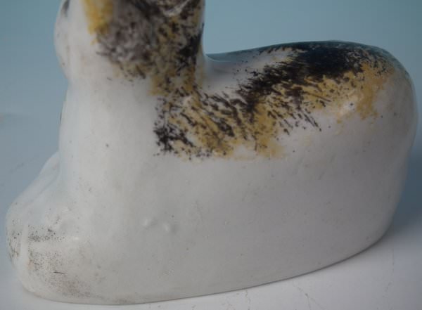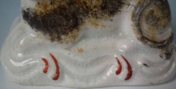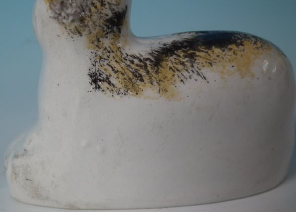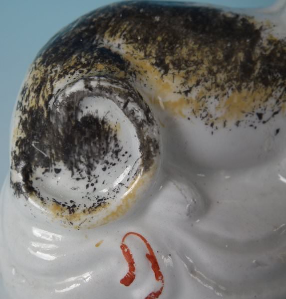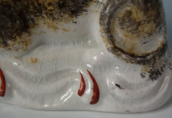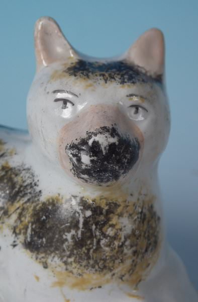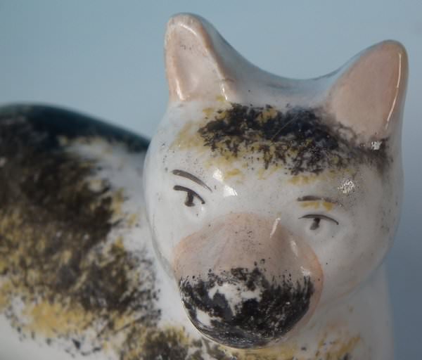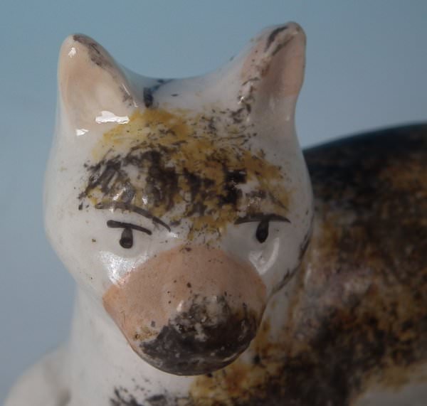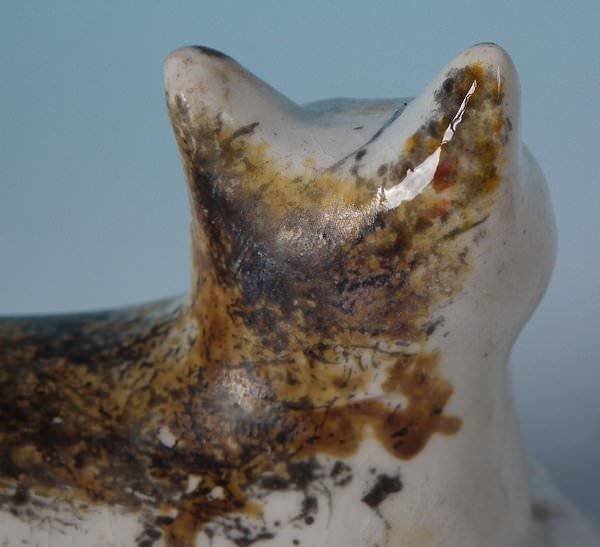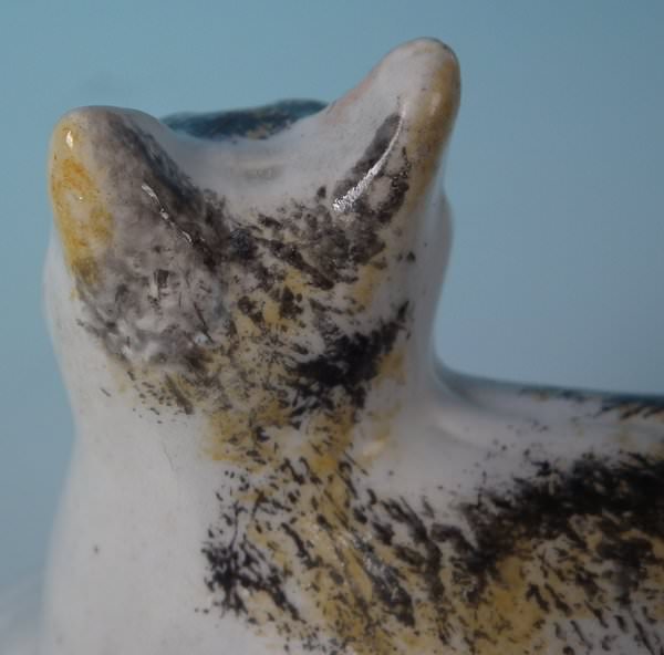 KILN EFFECT: piece of kiln detritus caught inside causing piece to rattle. RESTORATION: Filled chip to cat's right ear.