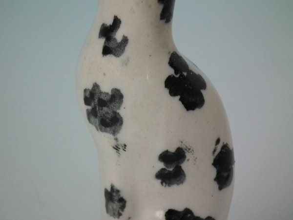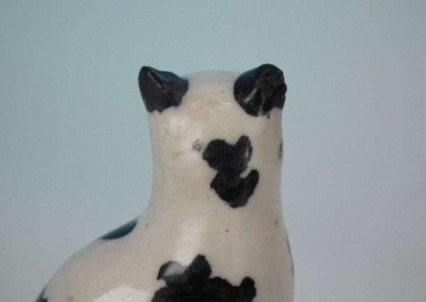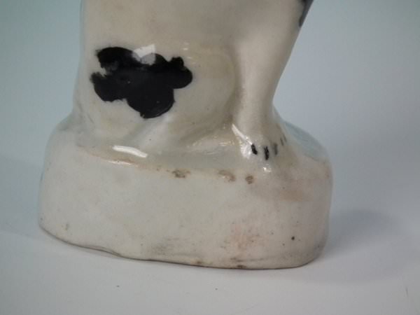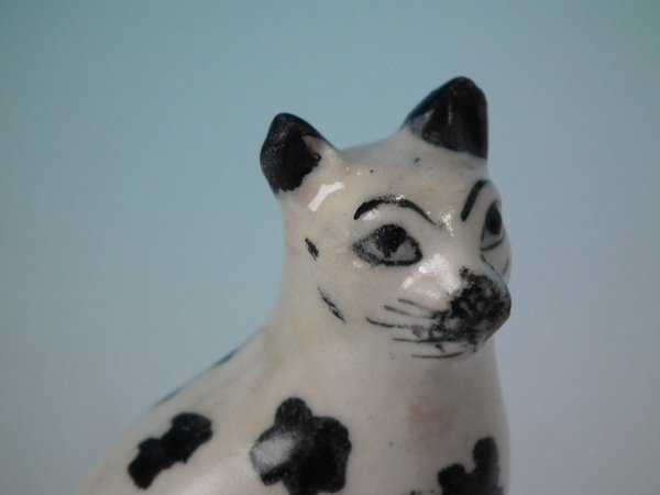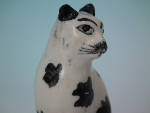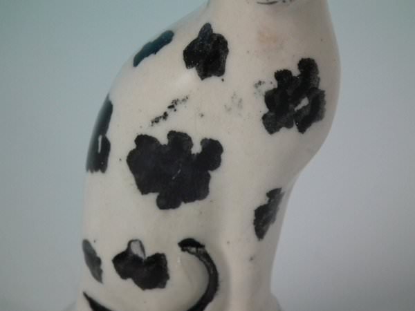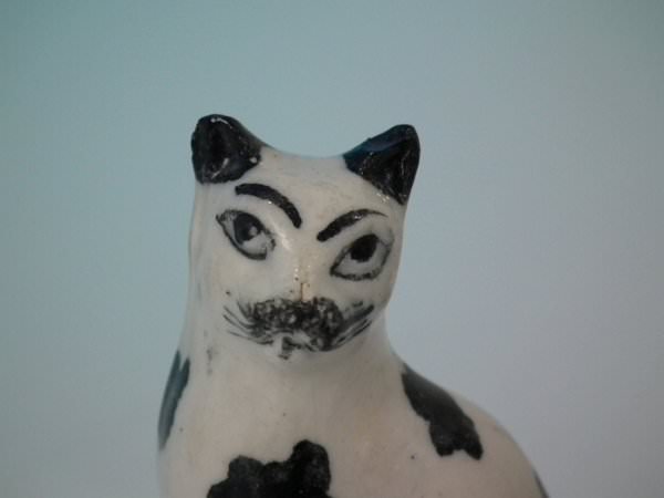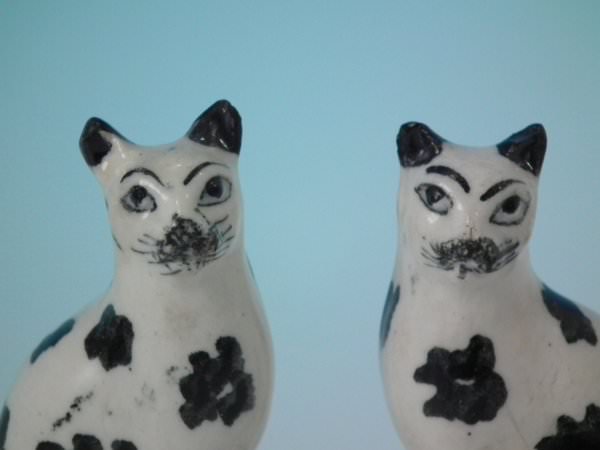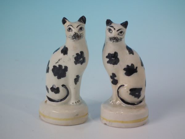 Pair of Staffordshire Pottery figures which feature cats, seated on an oval base.
