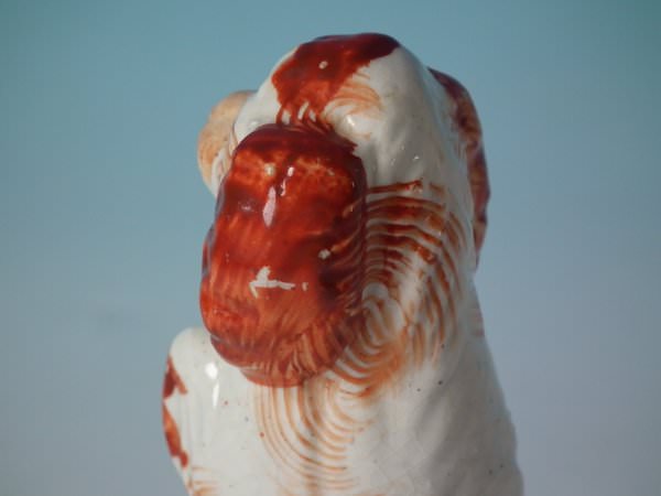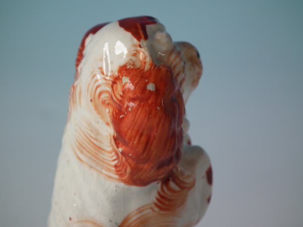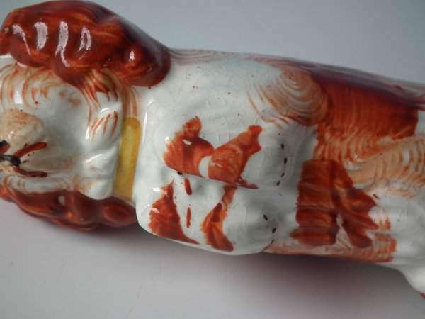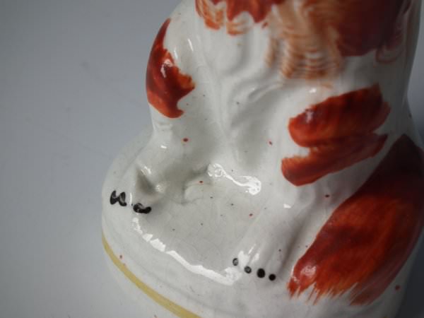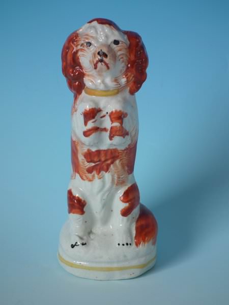 Victorian, circa 1860. 4.6ins high, 1.8ins wide, 1.8ins depth. Staffordshire Pottery figure which features a begging spaniel, seated on a circular base.