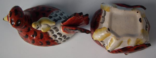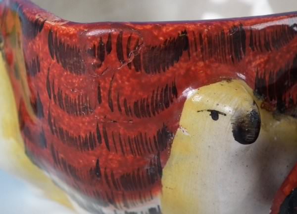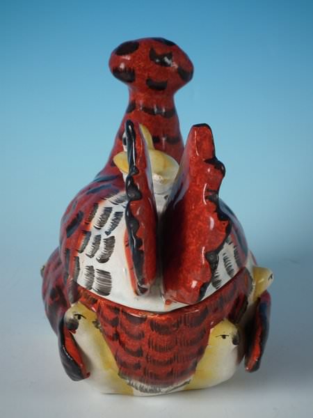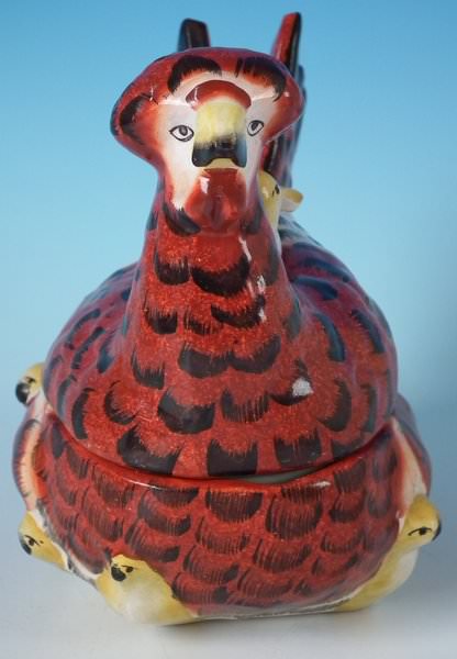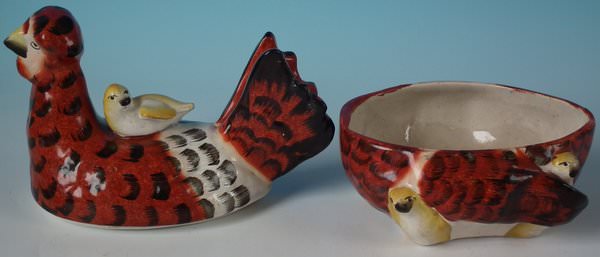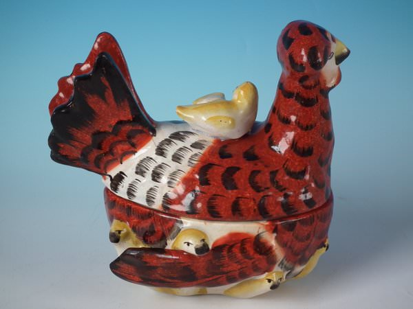Victorian, circa 1860. 6ins high, 6.3ins wide, 4.3ins depth. Staffordshire Pottery tureen with cover which features a French hen with her seven chicks. One of the chicks is perched on her back, the others peep out from underneath, resting on a shaped base.