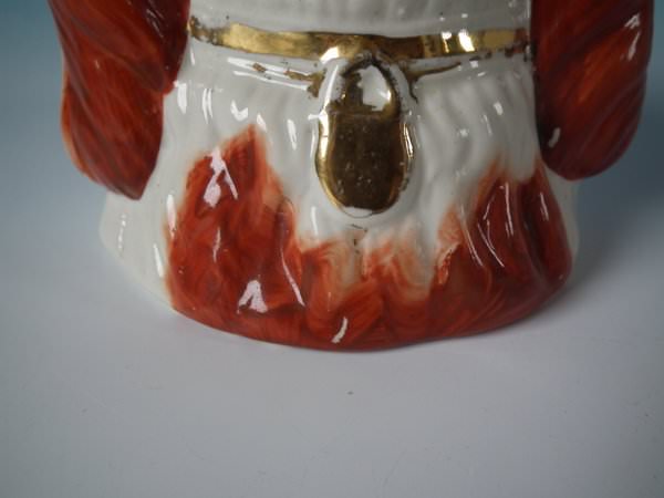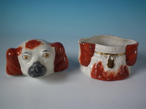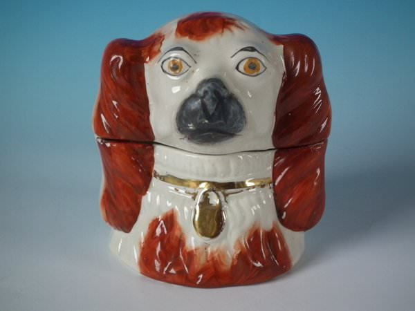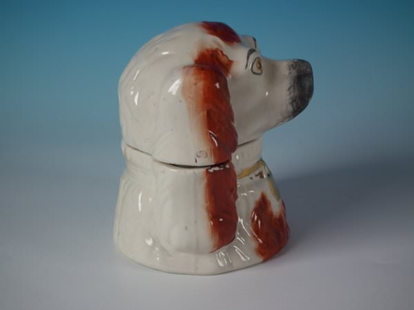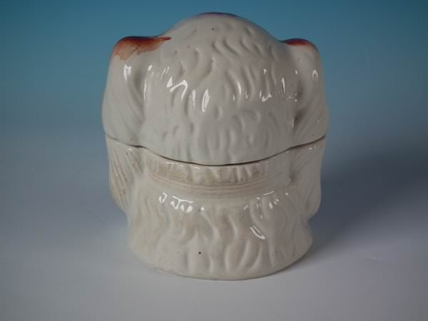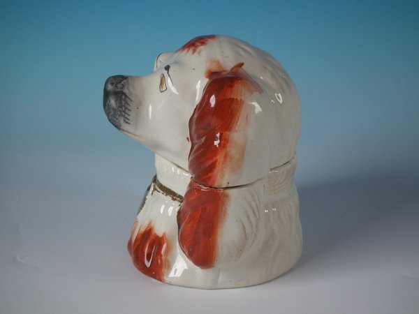 Victorian, circa 1880. 5.7ins high, 5.3ins wide, 4.5ins depth. Staffordshire Pottery tobacco jar and cover which features a spaniel's head, stood directly on the ground, no base. Russet and white version.