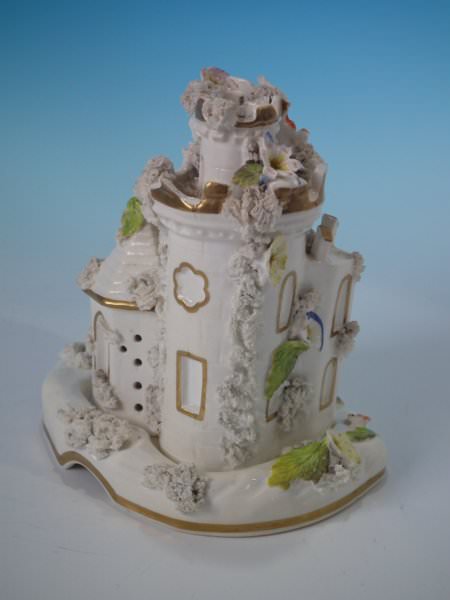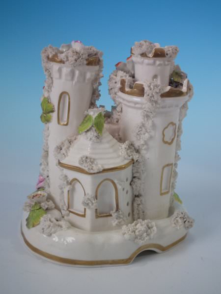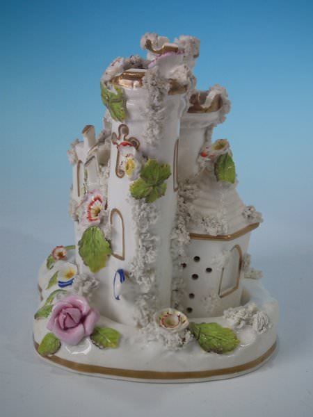 Staffordshire Pottery porcellaneous pastille burner which features a turreted castle, stood on a shaped detachable base.