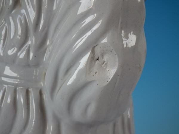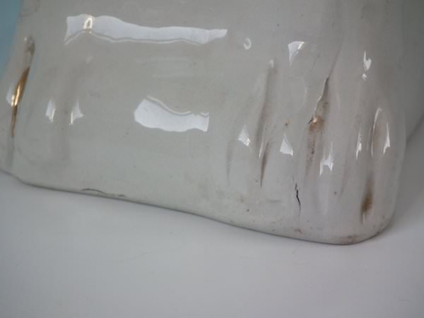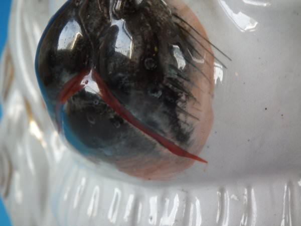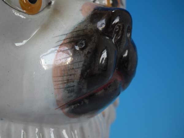 KILN EFFECTS: piece of kiln detritus caught in the glaze to muzzle;