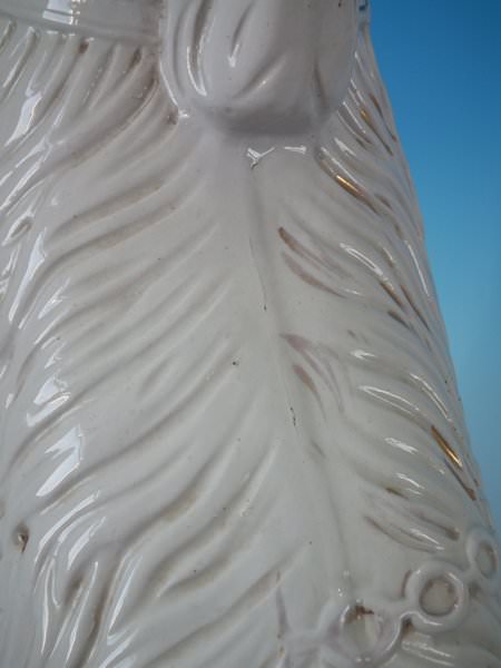 White and gilt version. Bright gilt embellishment. Flatback, decorated mainly to the front. Vent hole to the reverse.