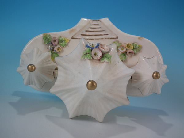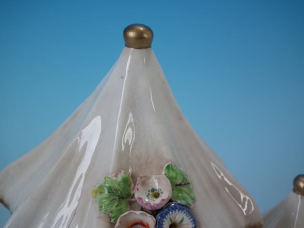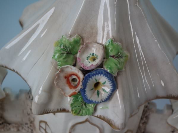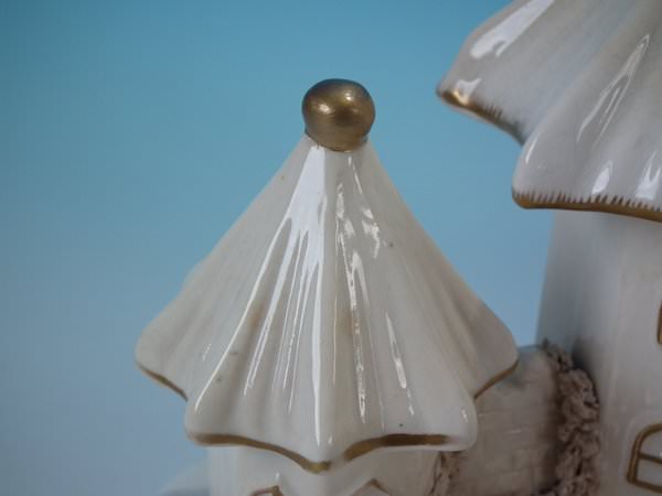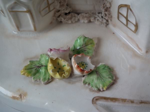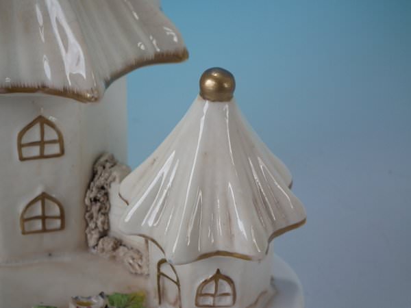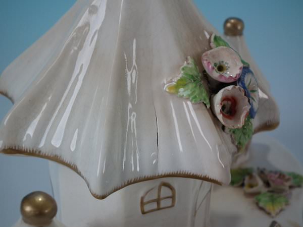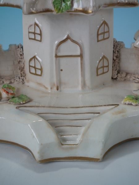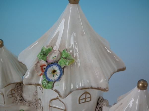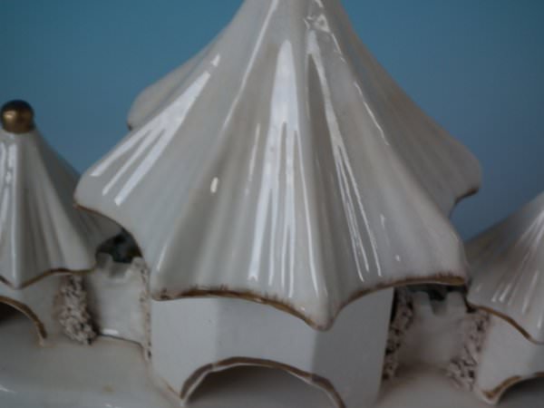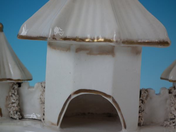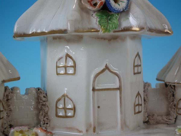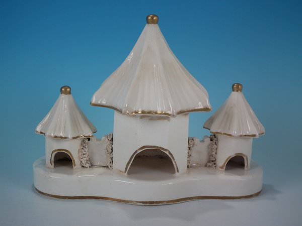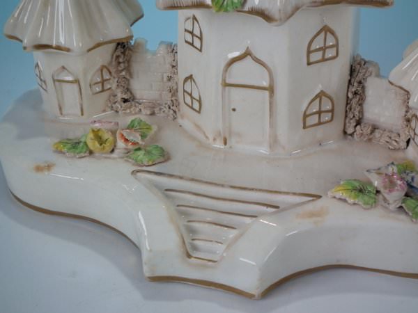 Staffordshire Pottery porcellaneous pastille burner which features a central house with a smaller house either side, stood on a shaped base.