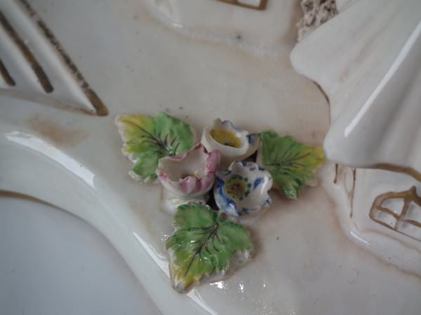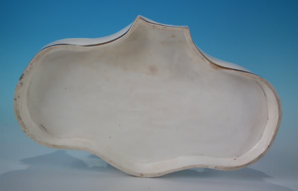 Dull gilt base line and embellishment. Flatback, decorated mainly to the front. Opening to the reverse.