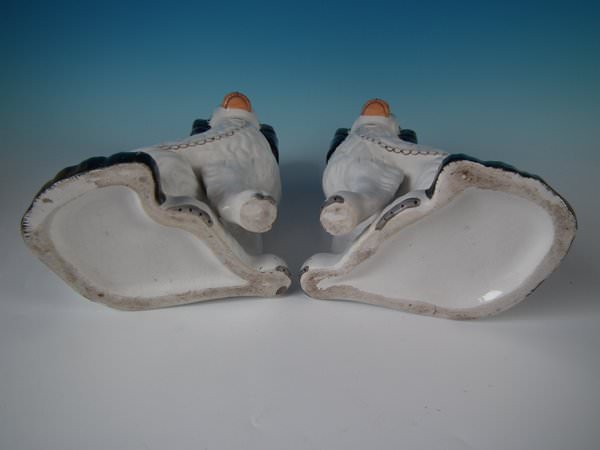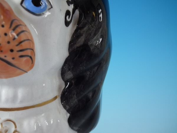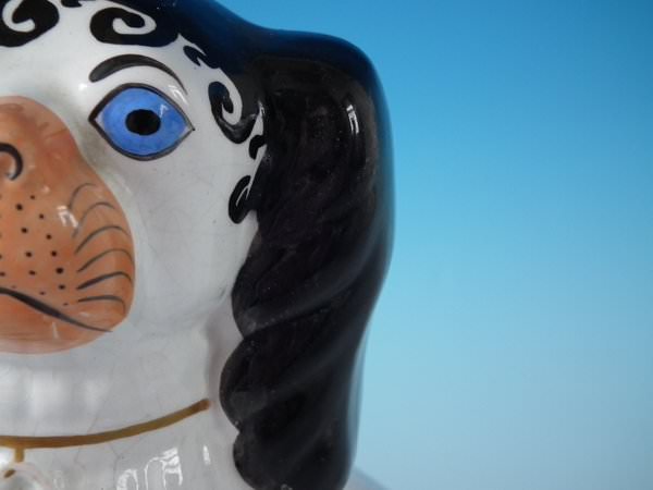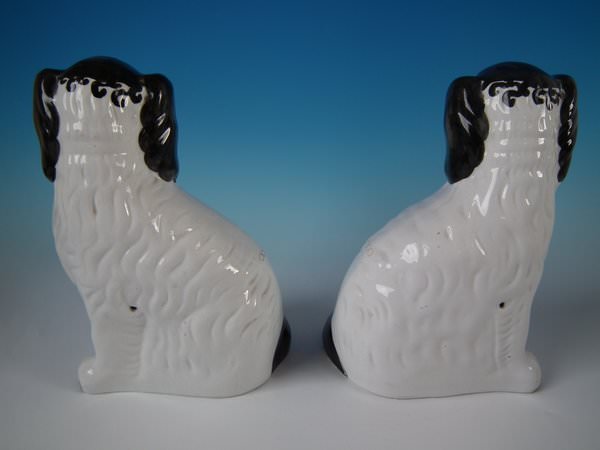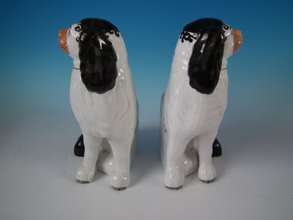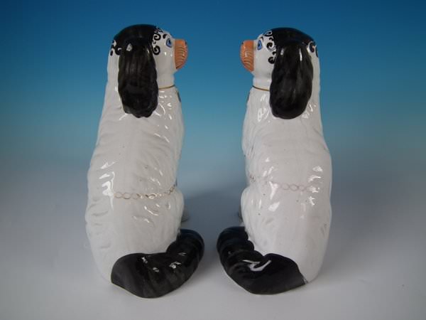 Victorian, circa 1860. Tallest is 10.2ins high, 7.3ins wide, 5.1ins depth. Pair of Staffordshire Pottery figures which feature a Disraeli spaniel with blue eyes, seated directly on the ground, no base. Dull gilt embellishment.