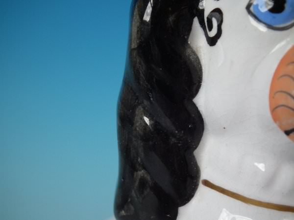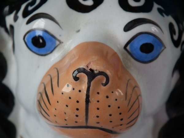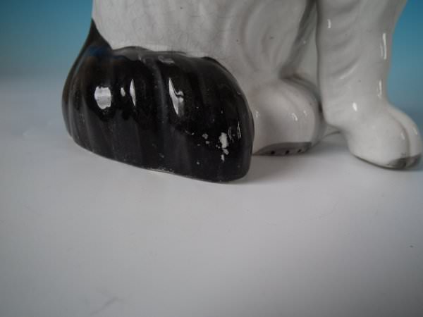 CONDITION: Right facing: Good. No restoration. Minor paint losses to dog's tail and dog's muzzle.