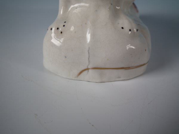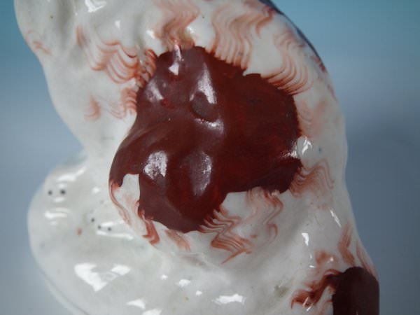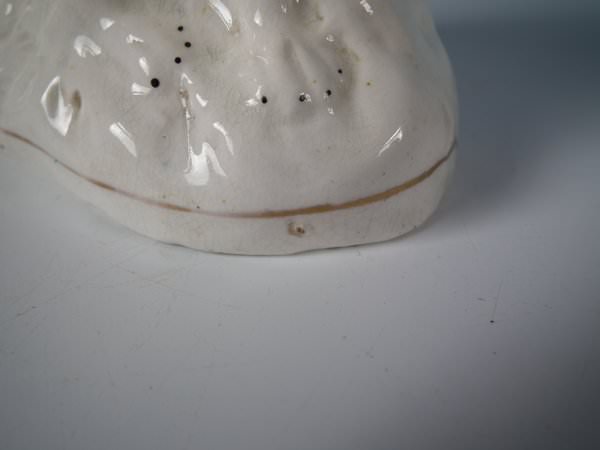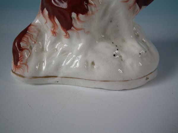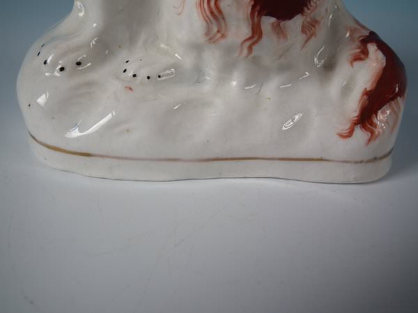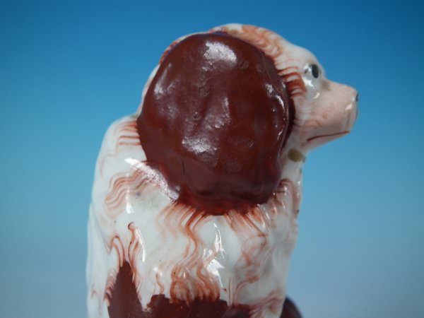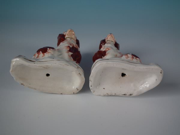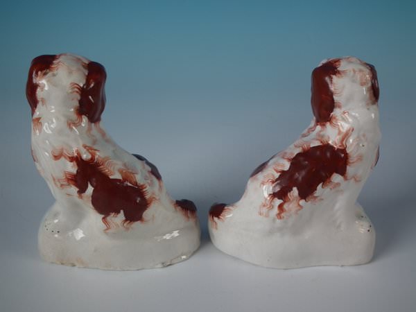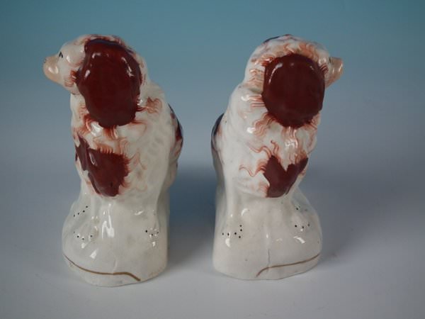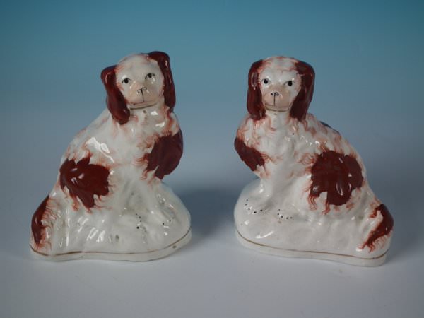 Victorian, circa 1860. Tallest is 4.5ins high, 3.7ins wide, 2.2ins depth. Pair of Staffordshire Pottery figures which feature a russet and white spaniel, seated on a shaped base. Dull gilt base line and embellishment.