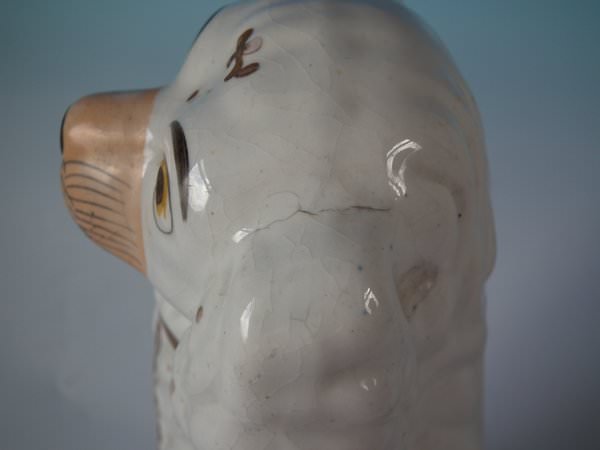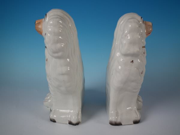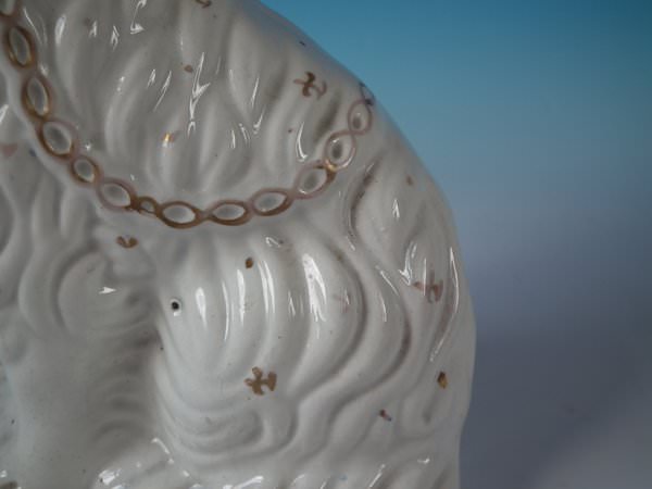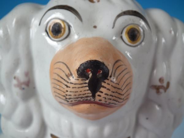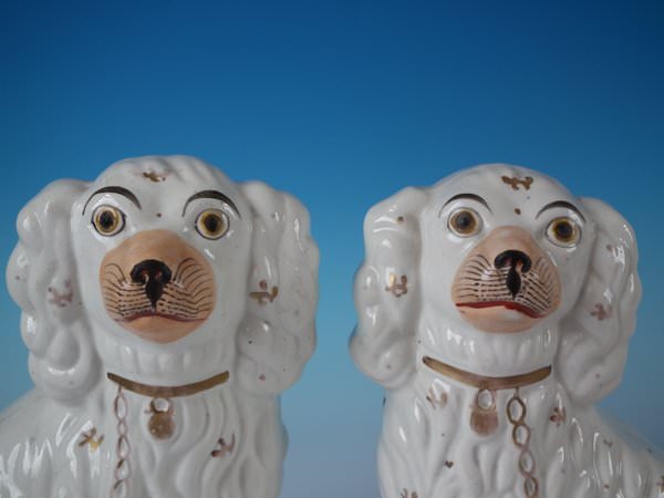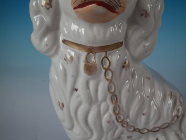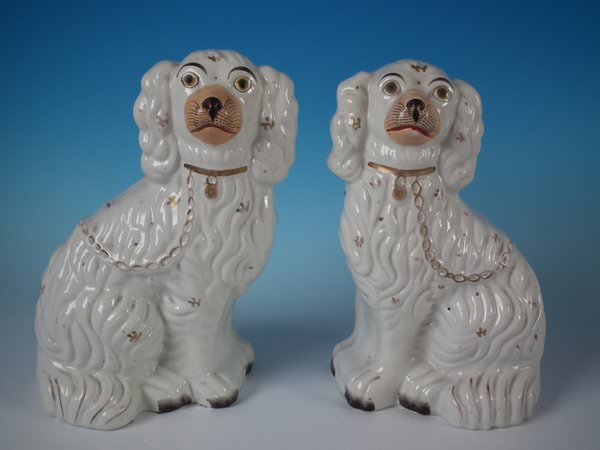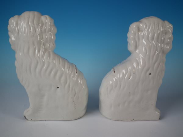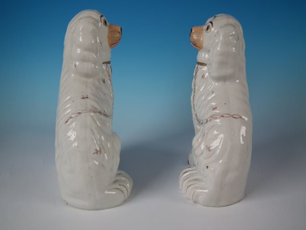 Victorian, circa 1860. Tallest is 10.2ins high, 6.3ins wide, 4.7ins depth. Pair of Staffordshire Pottery figures which feature a spaniel, seated directly on the ground, no base. White and gilt version.