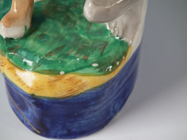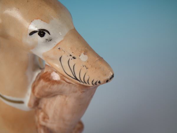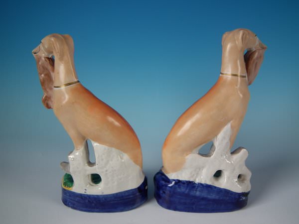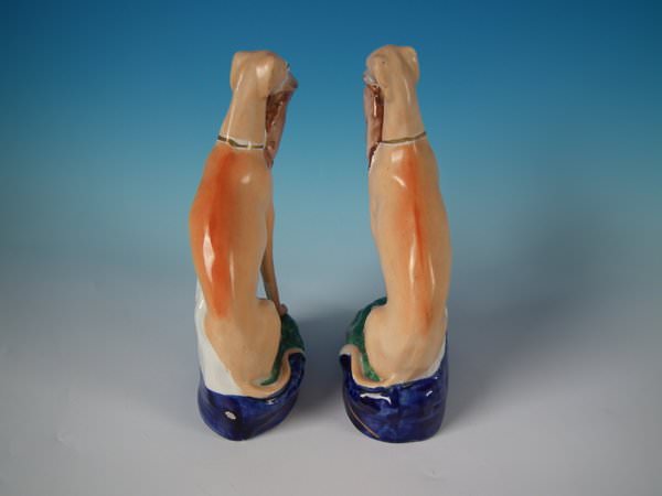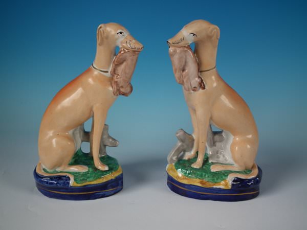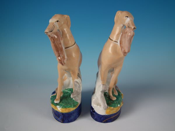 Victorian, circa 1860. Tallest is 9.8ins high, 5.5ins wide, 3.1ins depth. Pair of Staffordshire Pottery figures which feature a whippet holding a hare in it's mouth. A fence is behind the dogs, resting on an oblong base.