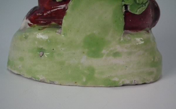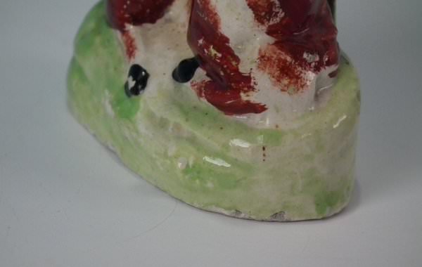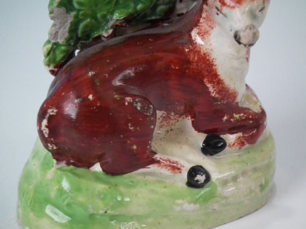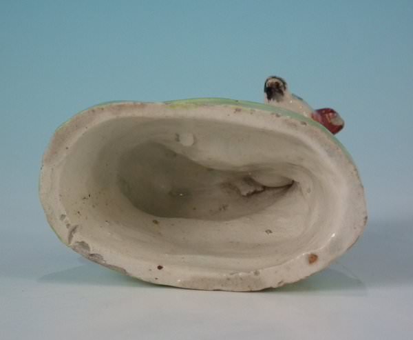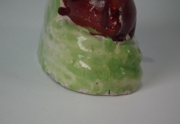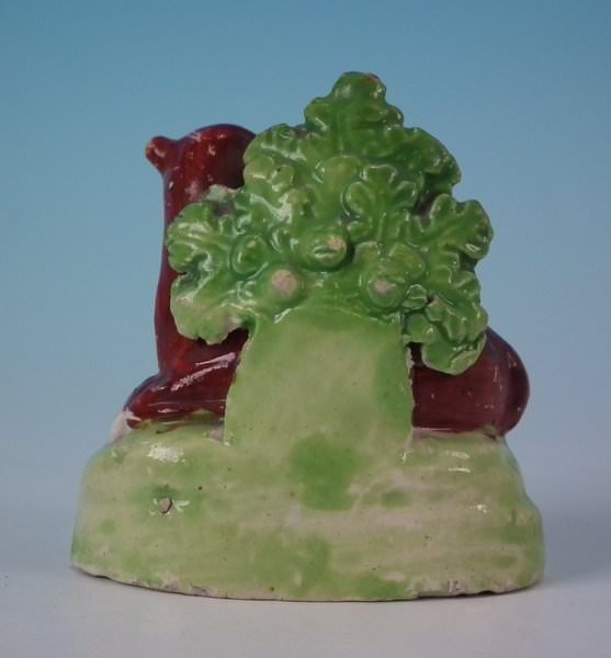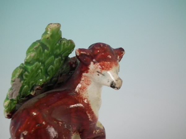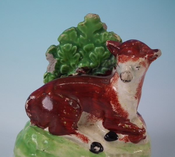 Staffordshire Pottery pearlware bocage figure which features a deer, recumbent on an oval hollow base.