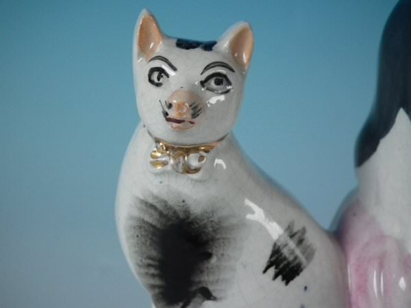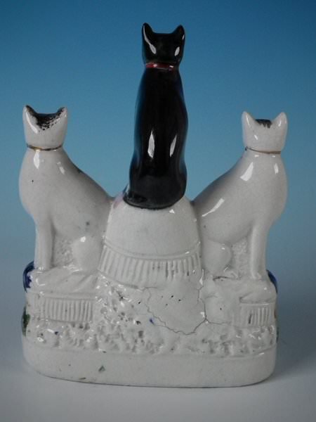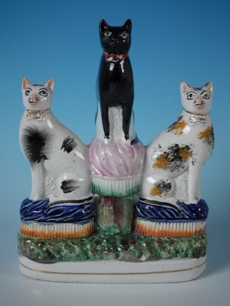 Victorian, circa 1870. 7.5ins high, 5.5ins wide, 2.4ins depth. Staffordshire Pottery figure which features three cats seated on cushions, resting on an oblong base.