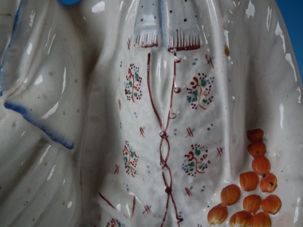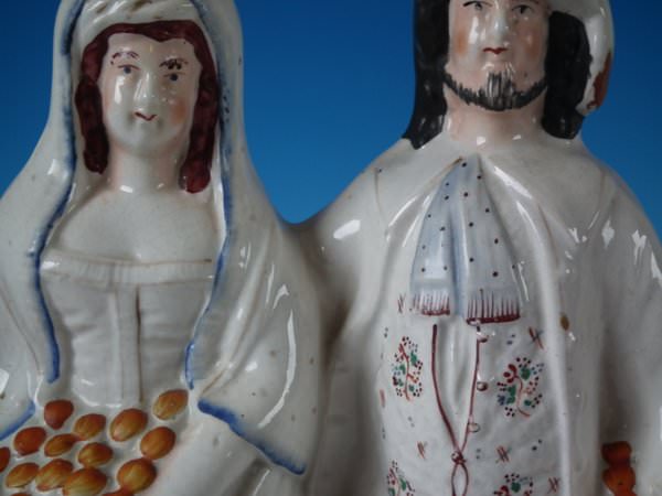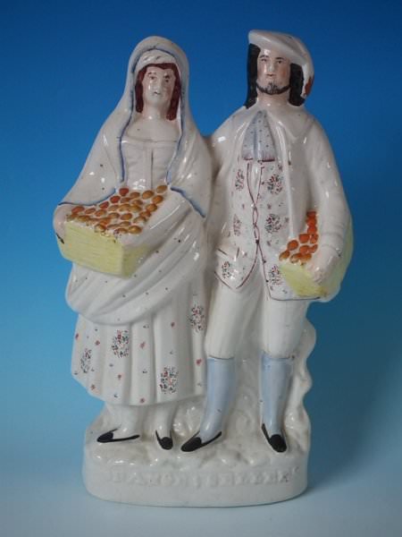 Victorian, circa 1860. 13.5ins high, 8.5ins wide, 3.4ins depth. Staffordshire Pottery group with a occupational theme which features a couple selling oranges, stood on an oval base.