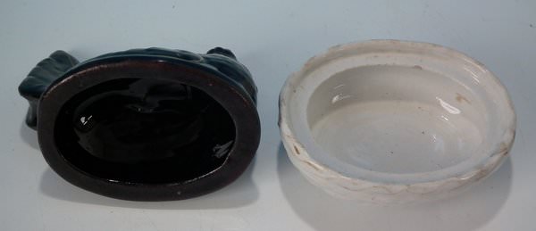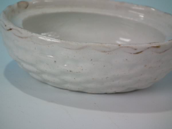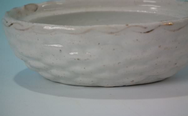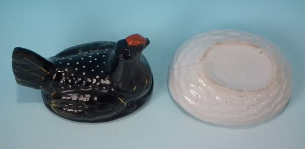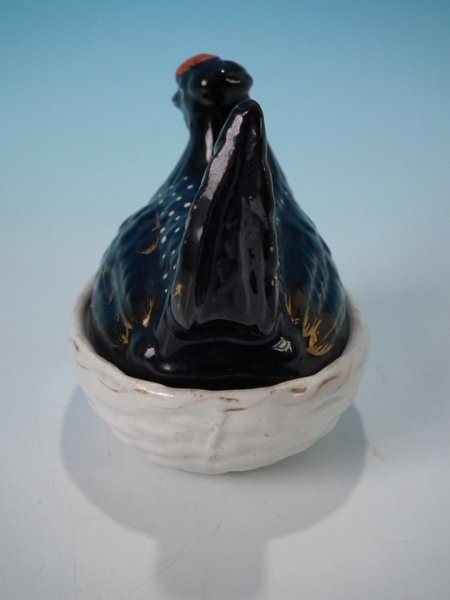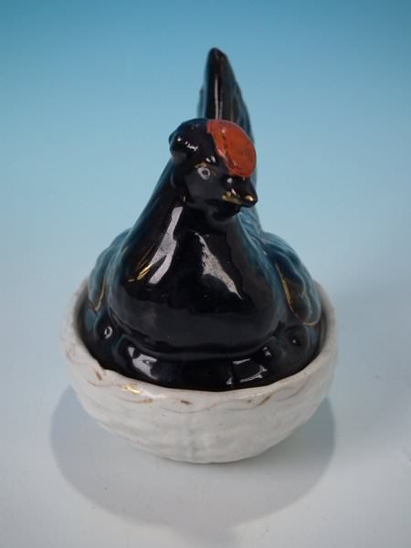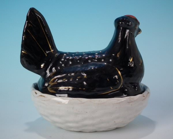 Staffordshire Pottery egg tureen and cover which features a hen on a basket, seated on a basketweave oval base.