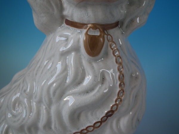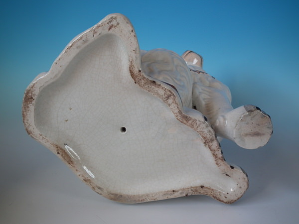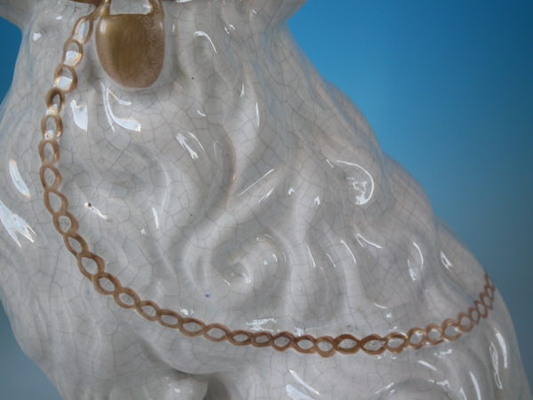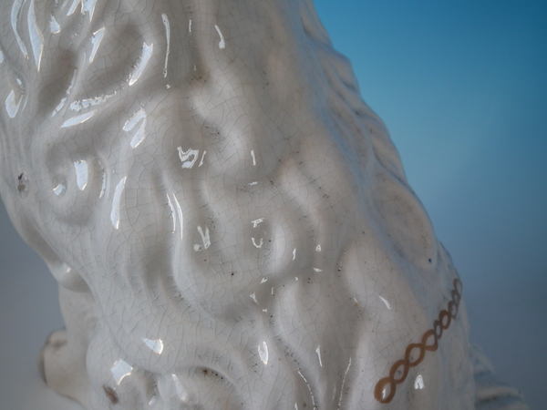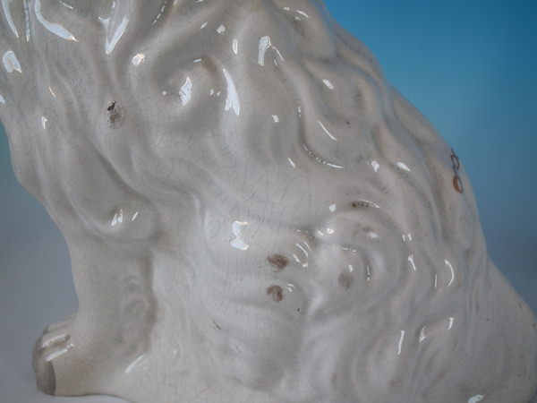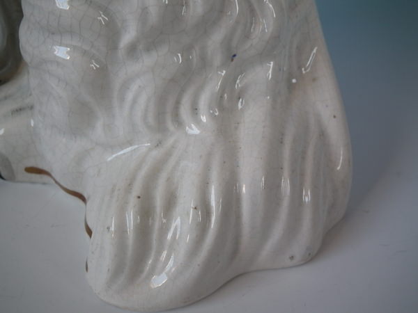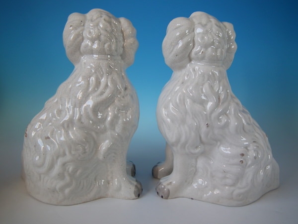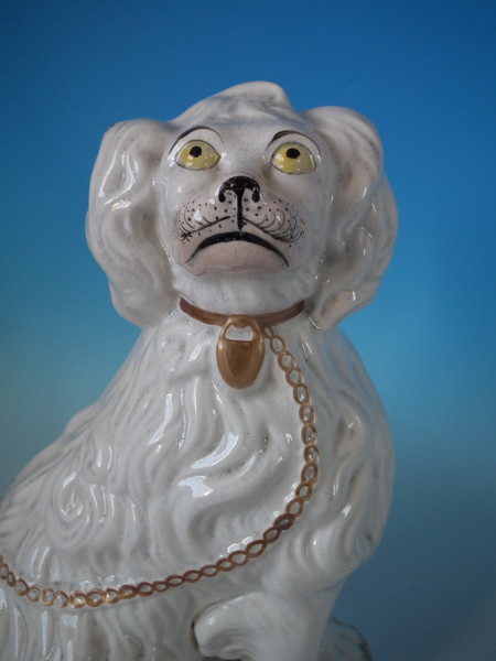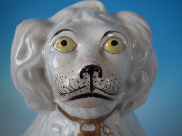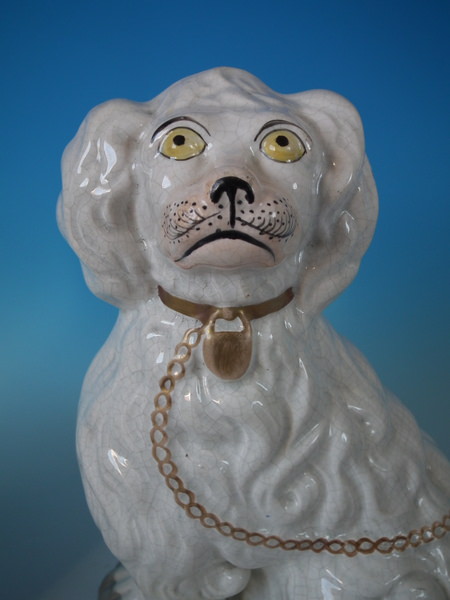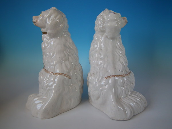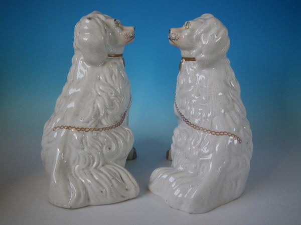 Victorian, circa 1860. Tallest is 12.4ins high, 9.8ins wide, 7.1ins depth. Pair of Staffordshire figures which feature a 'chunky' spaniel with front leg molded free, seated directly on the ground, no base.