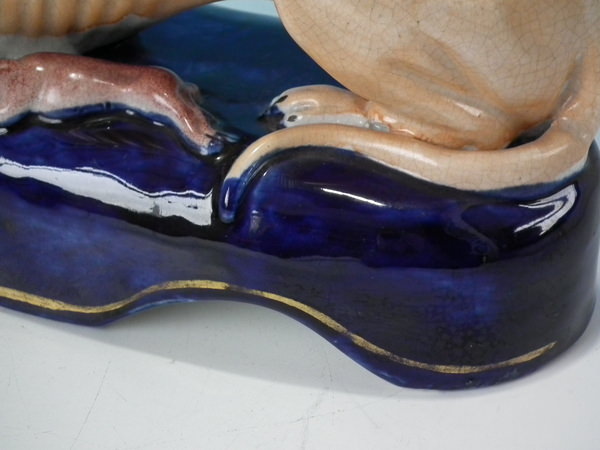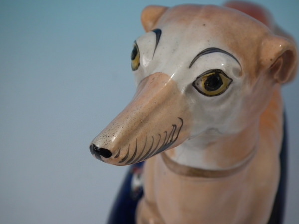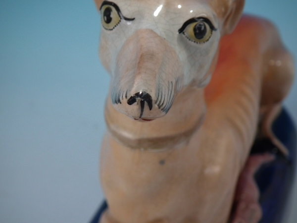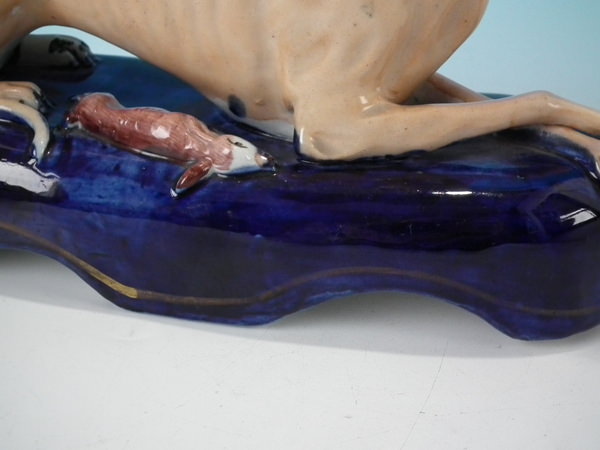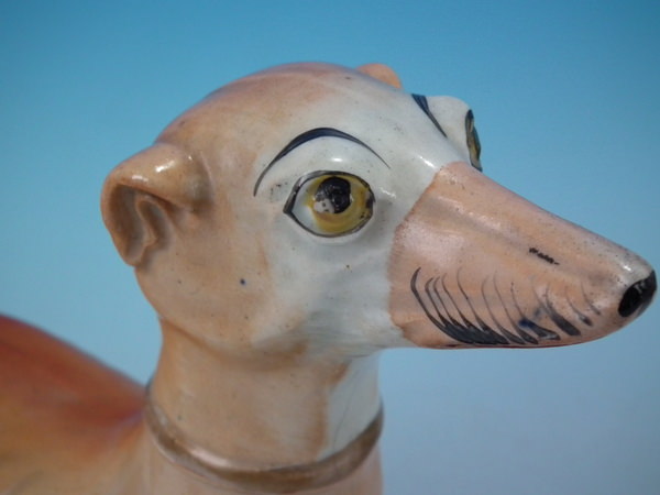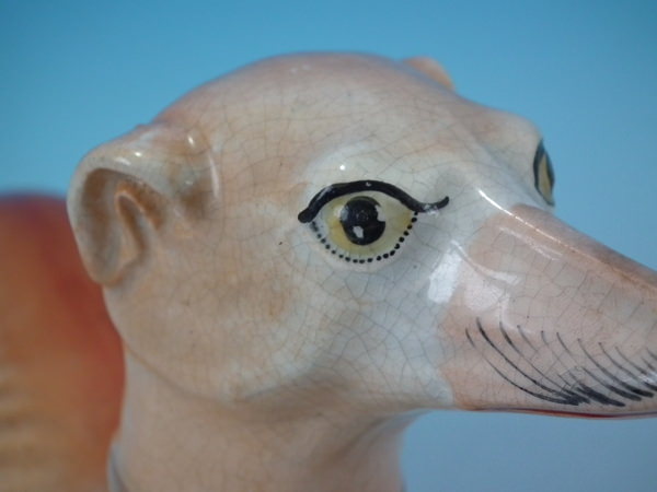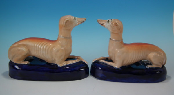 Pair of Staffordshire figures with a hunting theme which feature a whippet with a dead hare, recumbent on a shaped base.