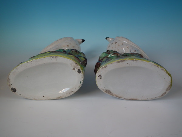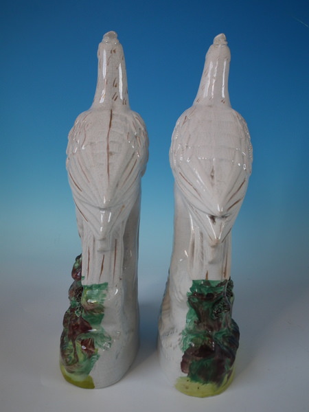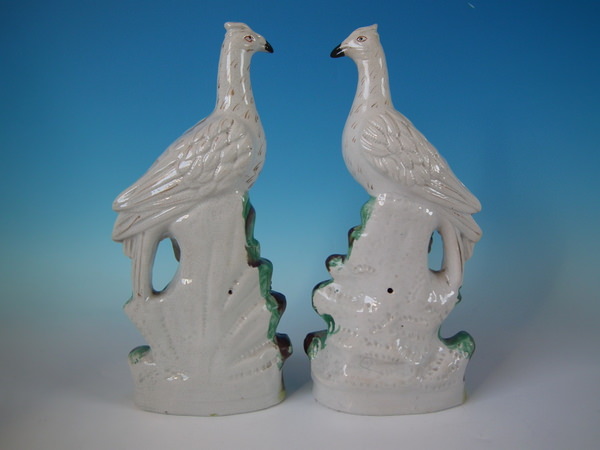 Victorian, circa 1860. Tallest is 12.8ins high, 5.9ins wide, 3ins depth. Pair of Staffordshire figures which feature birds, perched on a shaped base.