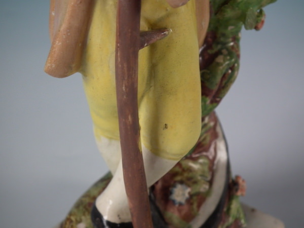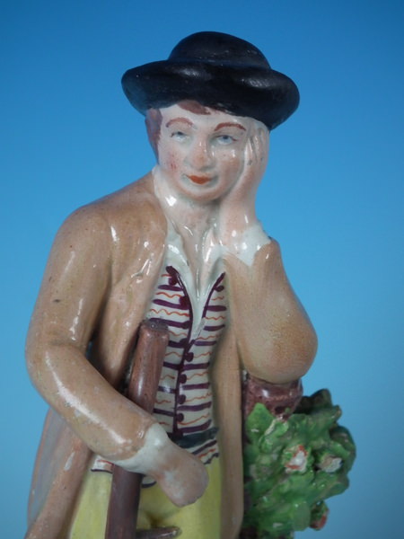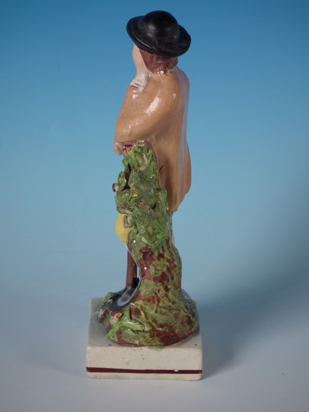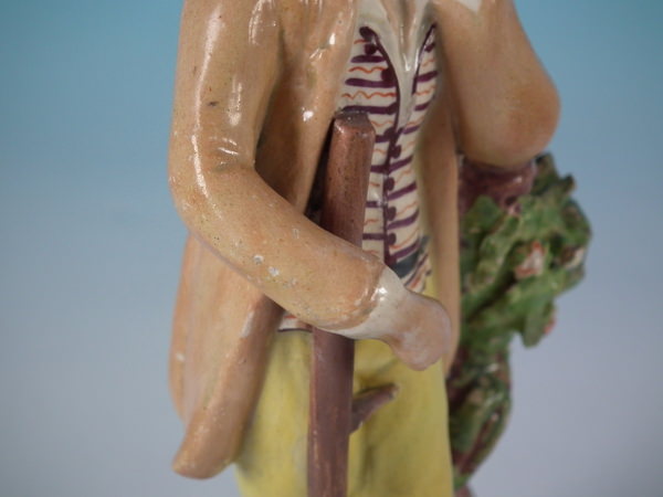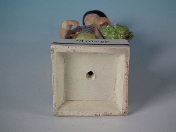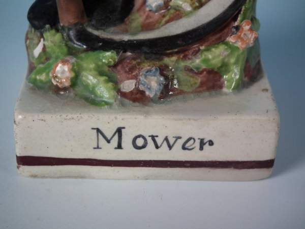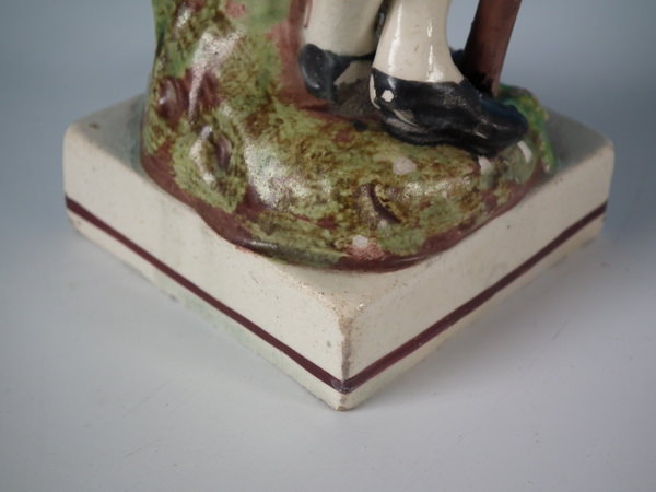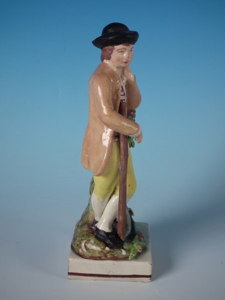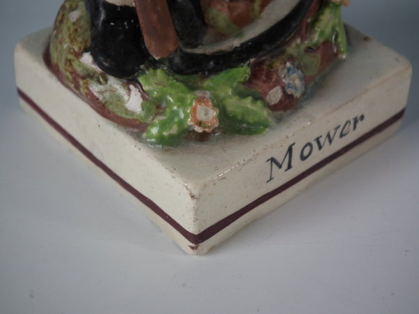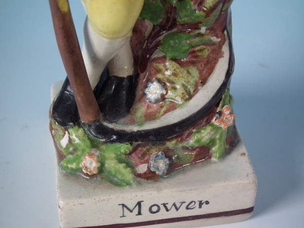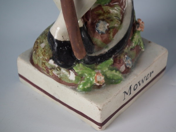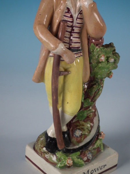 pre-Victorian, circa 1820. 7.5ins high, 2.6ins wide, 2.4ins depth. Staffordshire pearlware figure which features a man holding a scythe, stood on a square base.