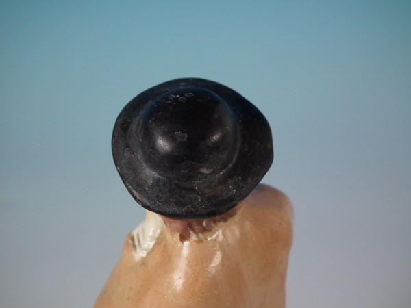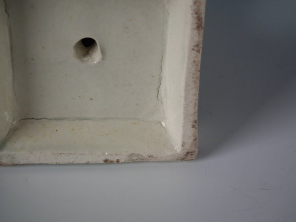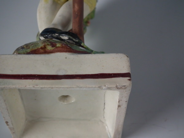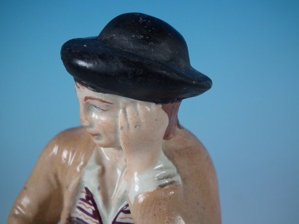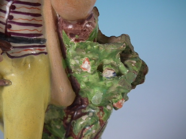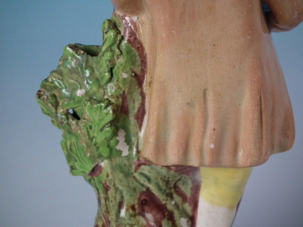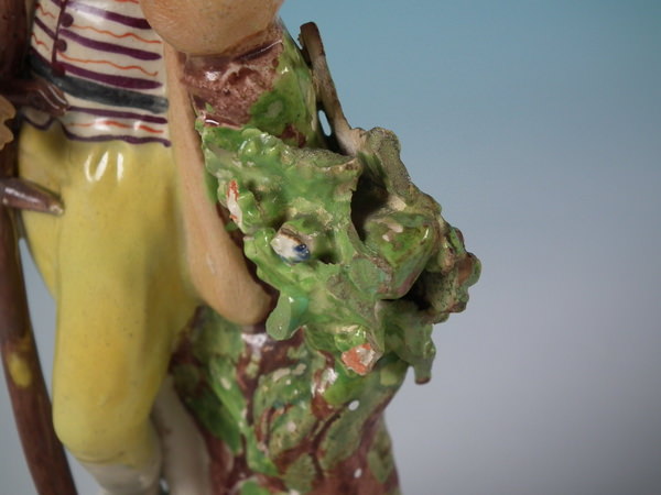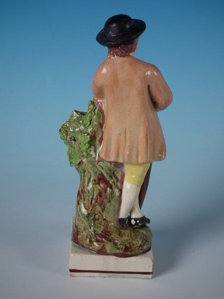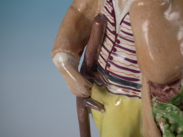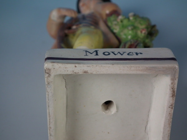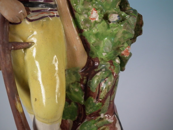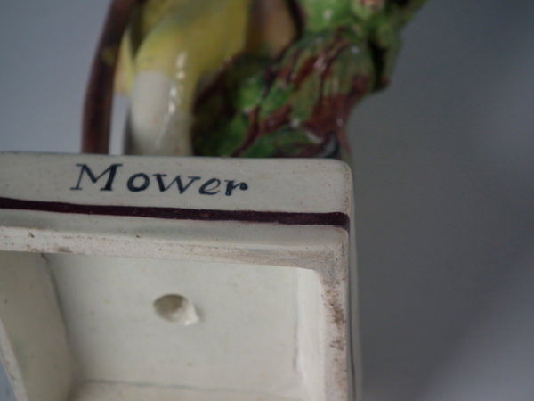 pre-Victorian, circa 1820. 7.5ins high, 2.6ins wide, 2.4ins depth. Staffordshire pearlware figure which features a man holding a scythe, stood on a square base.