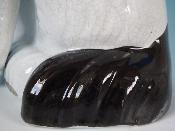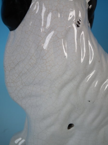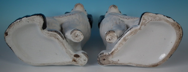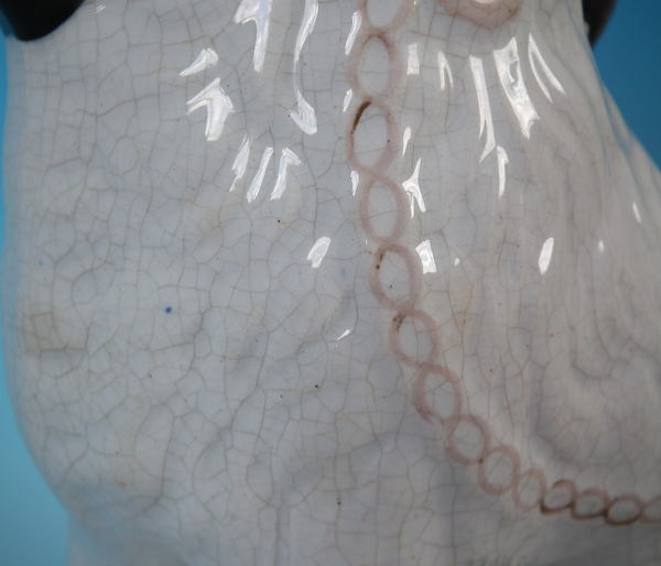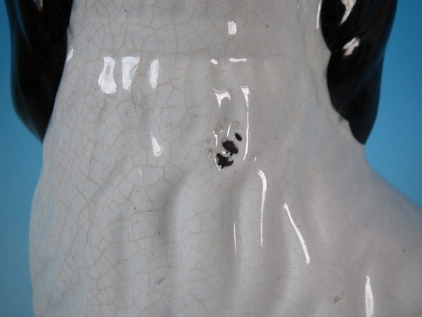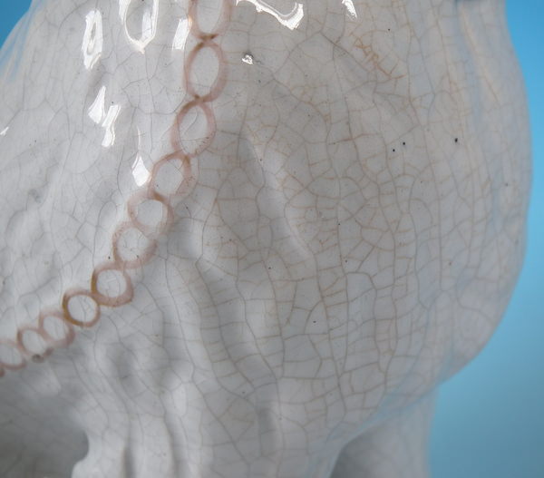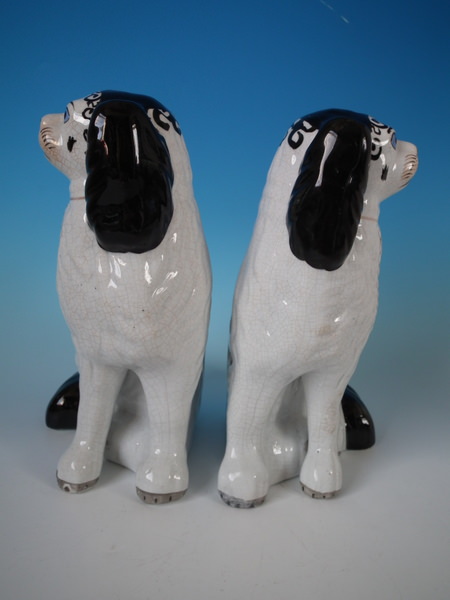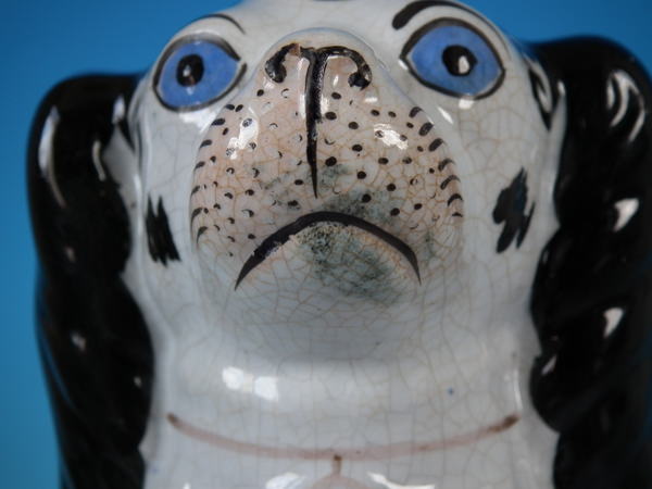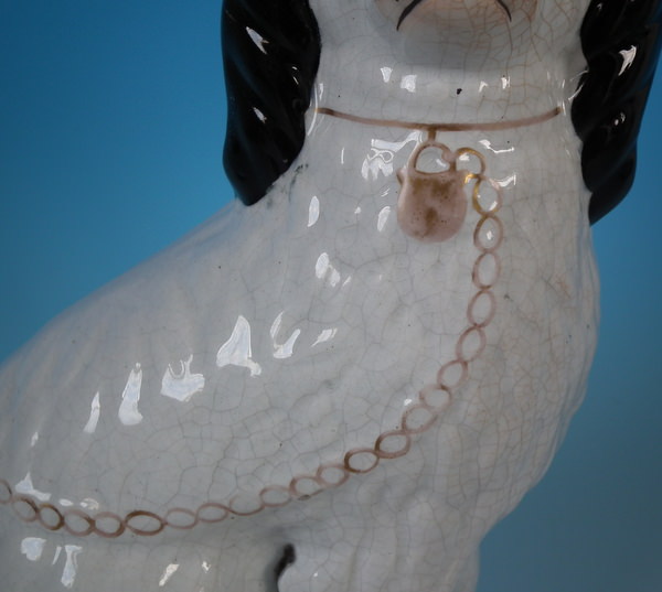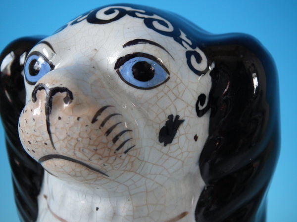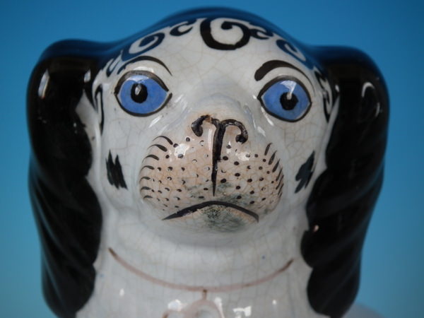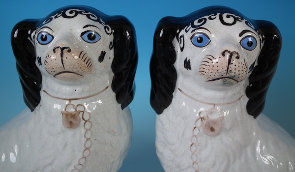 Victorian, circa 1860. Tallest is 10.2ins high, 7.7ins wide, 5.1ins depth. Pair of Staffordshire figures which feature a Disraeli spaniel with blue eyes, seated directly on the ground, no base. White version. Dull gilt embellishment. Decorated mainly to the front.