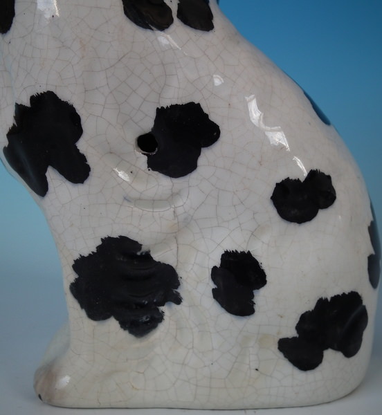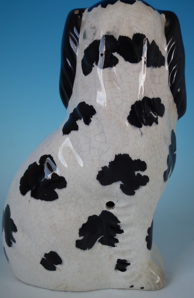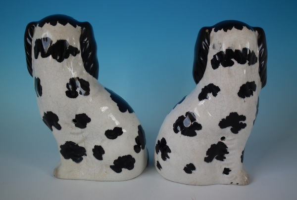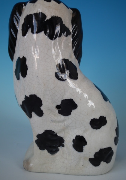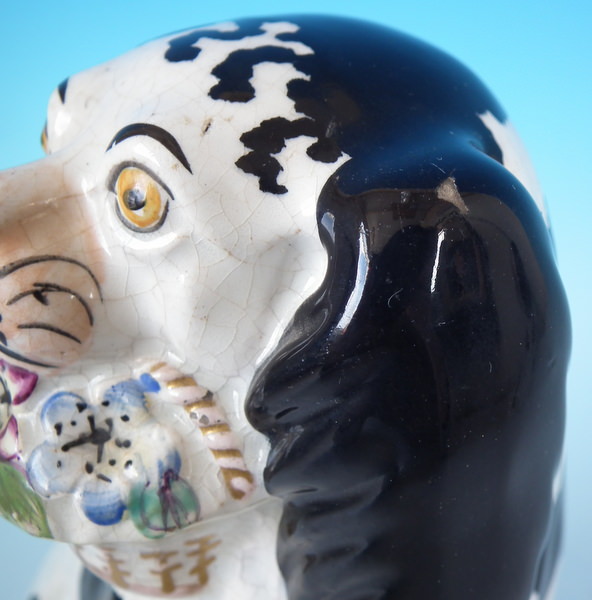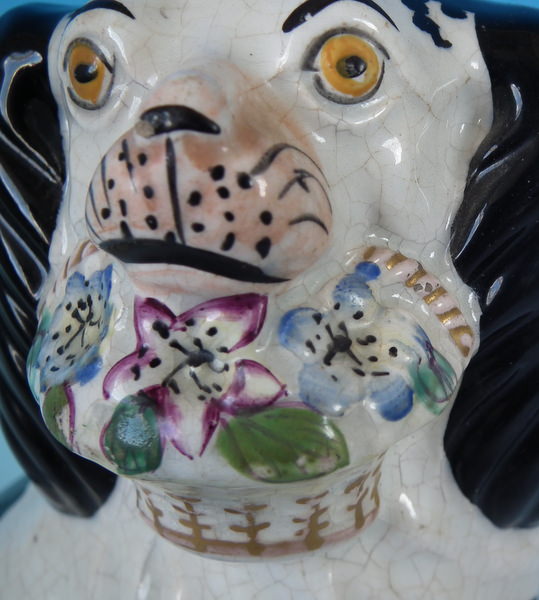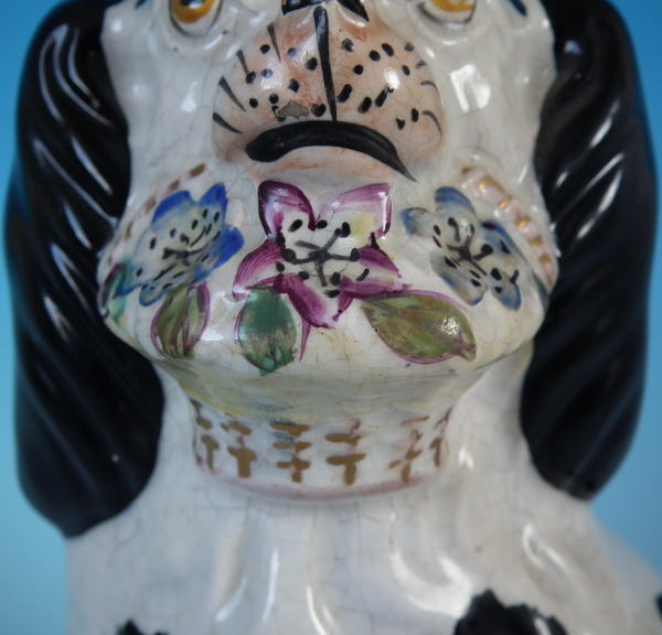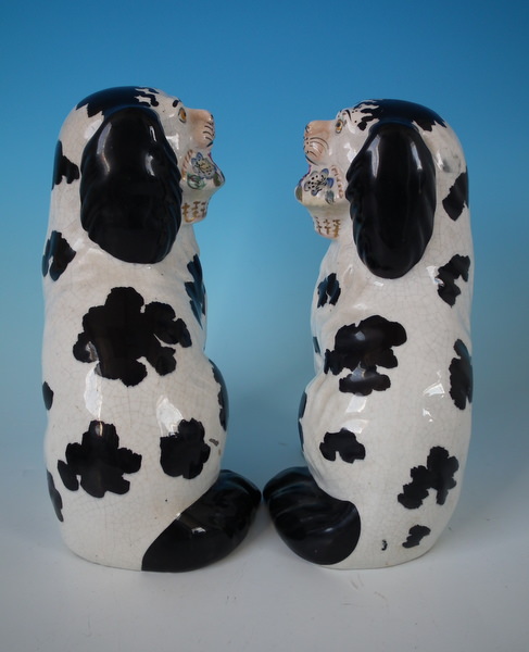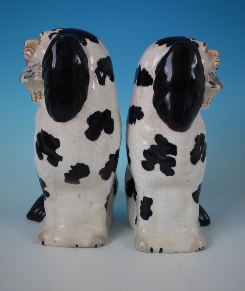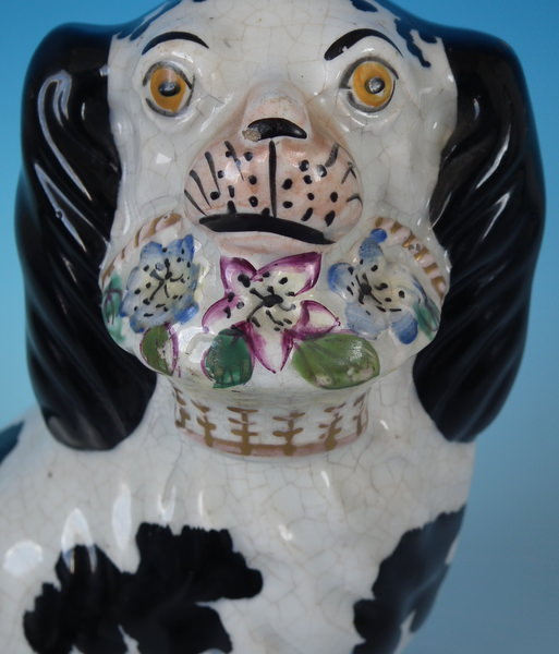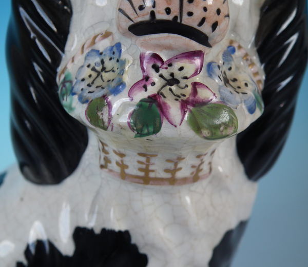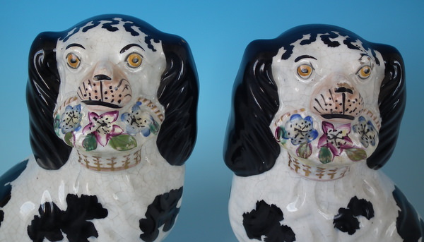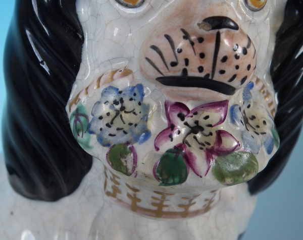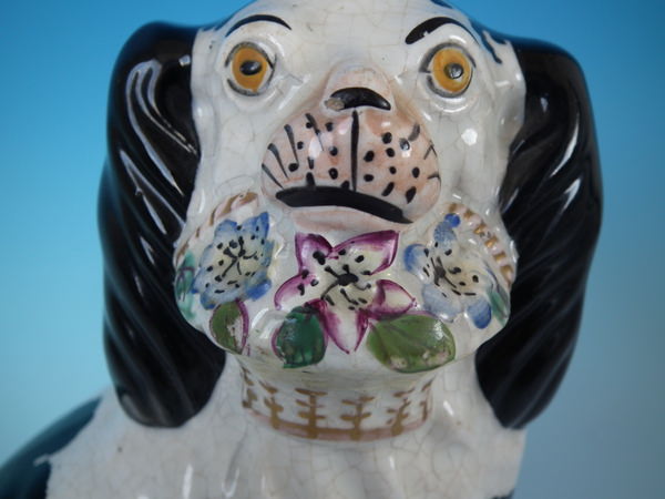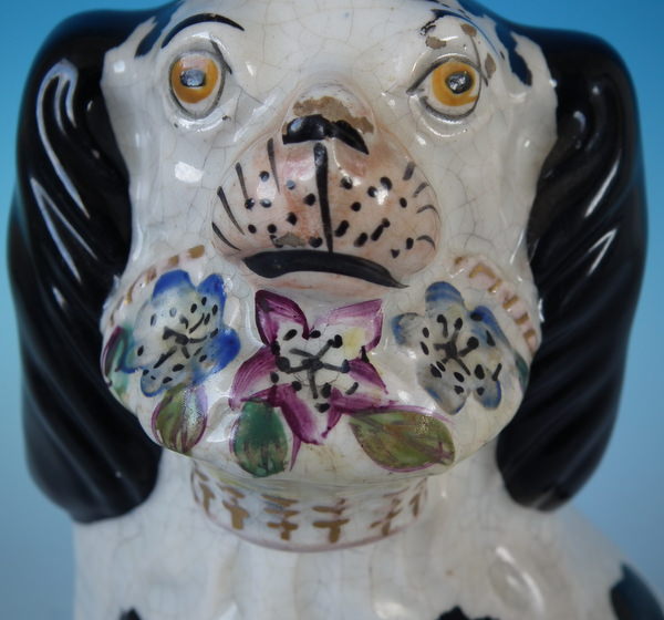 Victorian, circa 1860. Tallest is 7.8ins high, 5.1ins wide, 3.7ins depth. Pair of Staffordshire figures which feature a spaniel with Disraeli curls on it's head and a flower basket in it's mouth (The curls represent Disraeli's, elected Prime Minister 1868 and Queen Victoria’s favourite), seated directly on the ground, no base. Dull gilt embellishment.