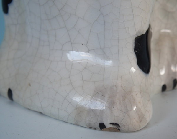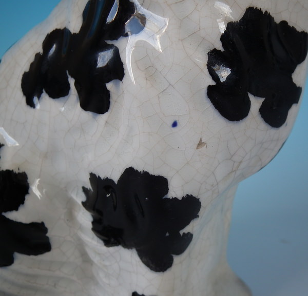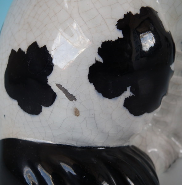 Left facing: Generally good. Flakes to basket handle, front left paw, nose, left eyebrow and ear.