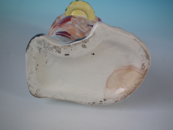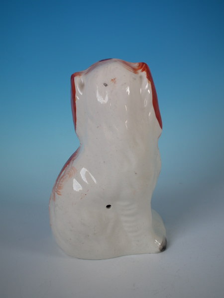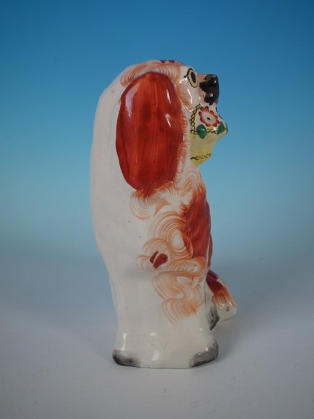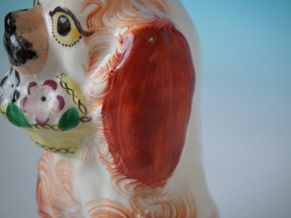 Victorian, circa 1860. 7.5ins high, 4.7ins wide, 3.5ins depth. Staffordshire figure which features a spaniel holding a flower basket in its mouth, seated directly on the ground, no base.