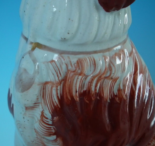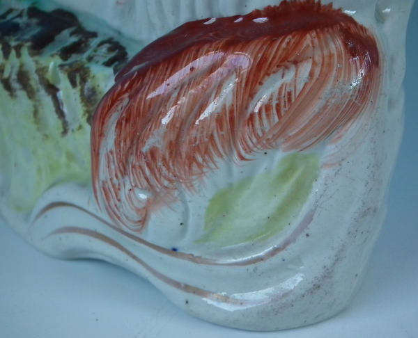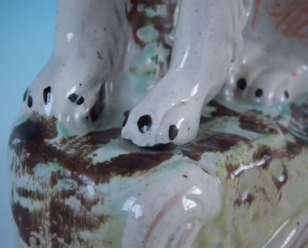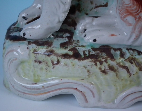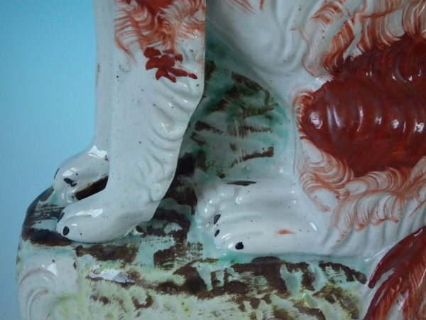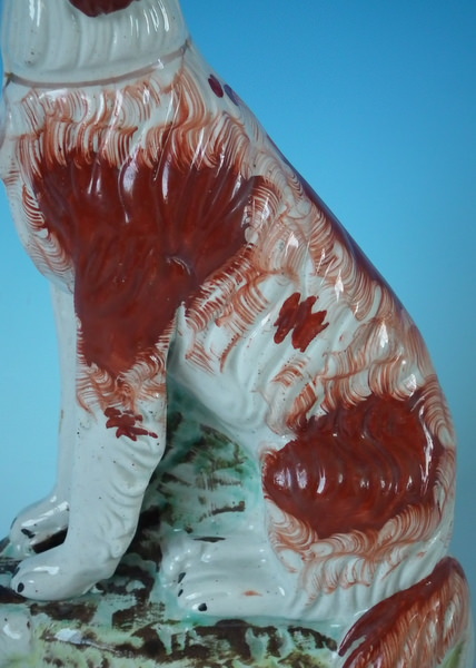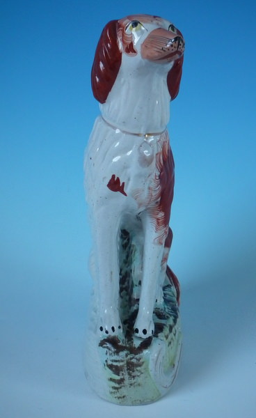 Victorian, circa 1860. 10.7ins high, 6.1ins wide, 3.2ins depth. Staffordshire figure which features an Irish Setter, seated on a scroll work base. Dull gilt embellishment.