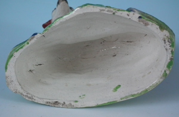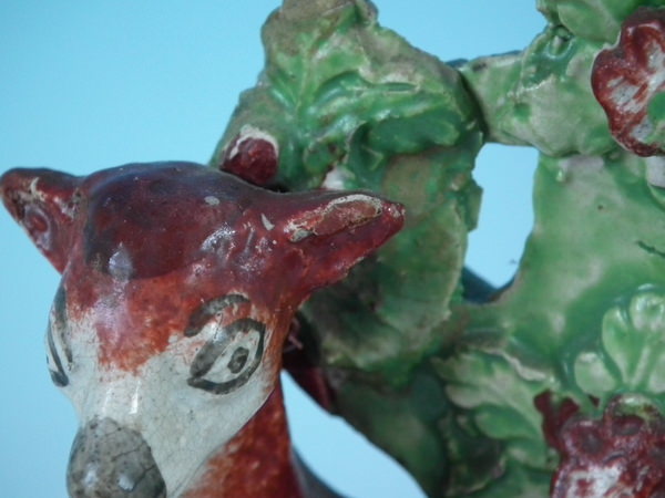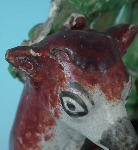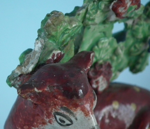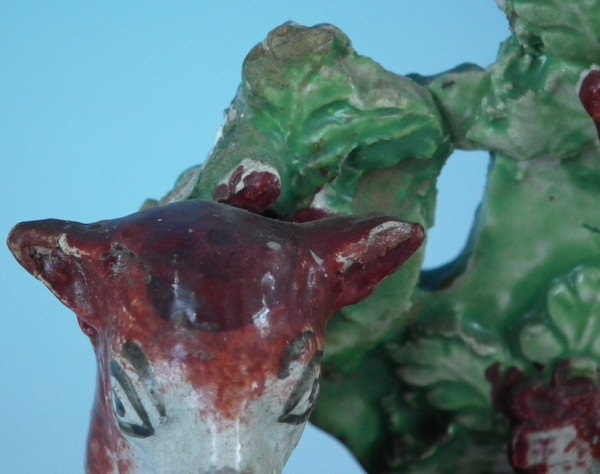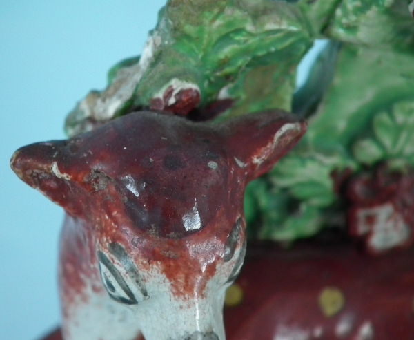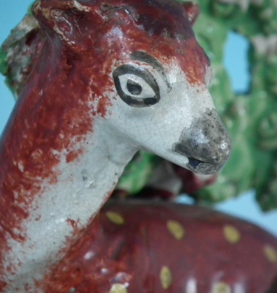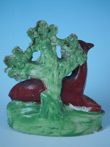 pre-Victorian, circa 1820. 4.7ins high, 4.1ins wide, 2.5ins depth. Staffordshire pearlware bocage figure which features a deer, recumbent on a shaped hollow base.
