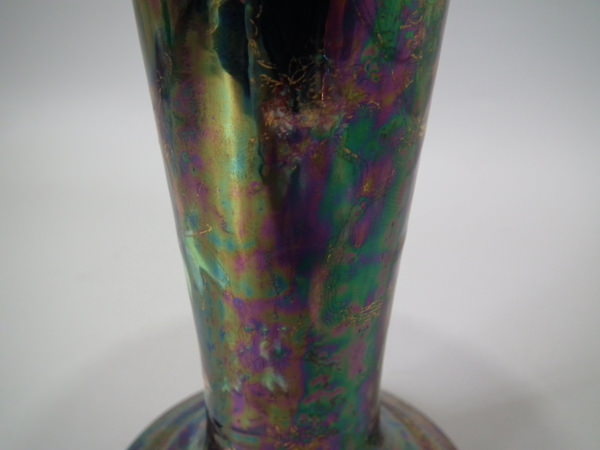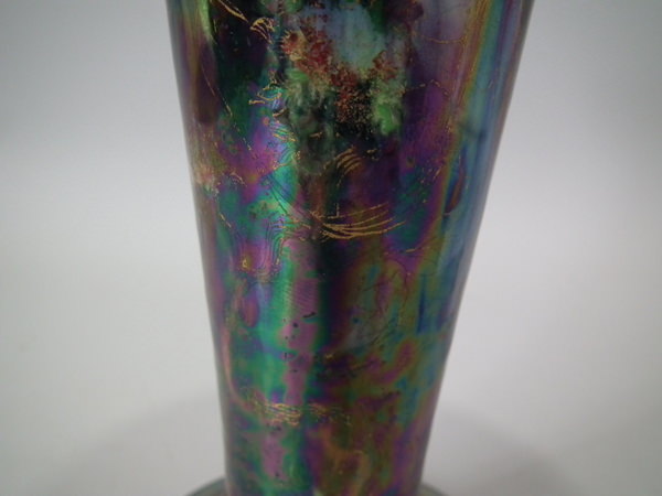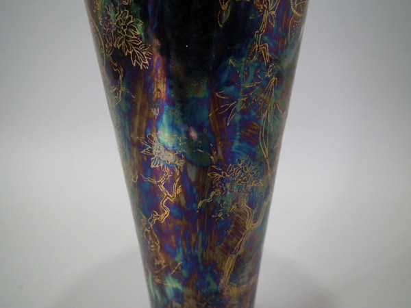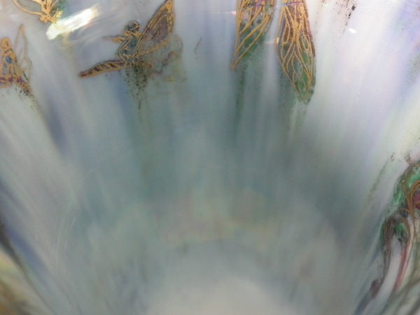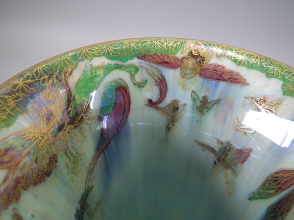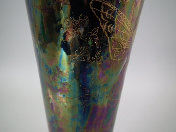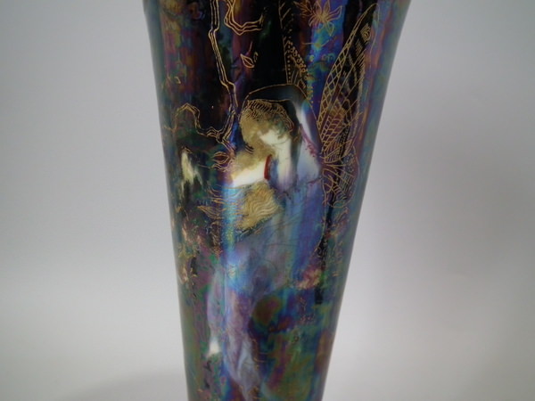 Circa 1920. 9.5ins high, 4.75ins wide. Pair Wedgwood Lustreware Fairyland 'Butterfly Women' vases, shape number 2810. The vases are decorated in the Butterfly woman pattern, which features fairies perched on a branch, on a black ground. The inside of the rim is decorated in the floating fairies pattern, which features a leaf border and elfish creatures riding birds and butterflies. Mother of pearl ground.
