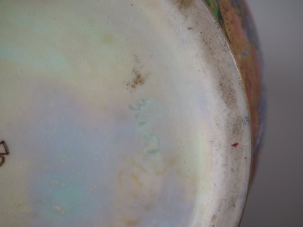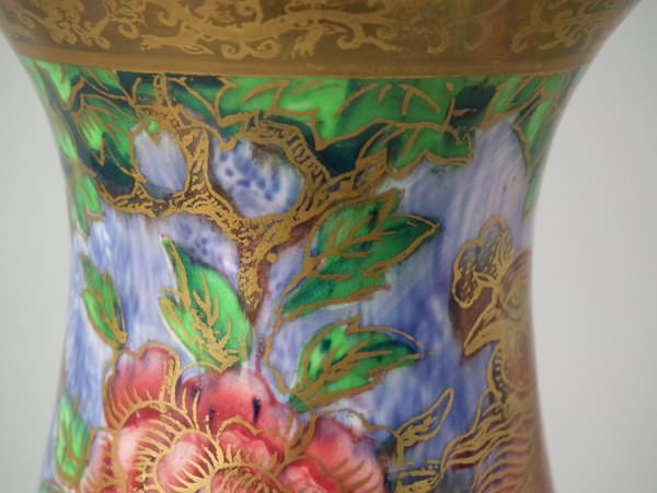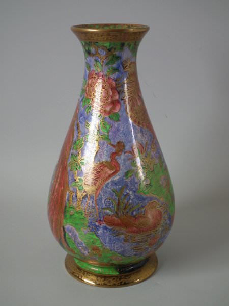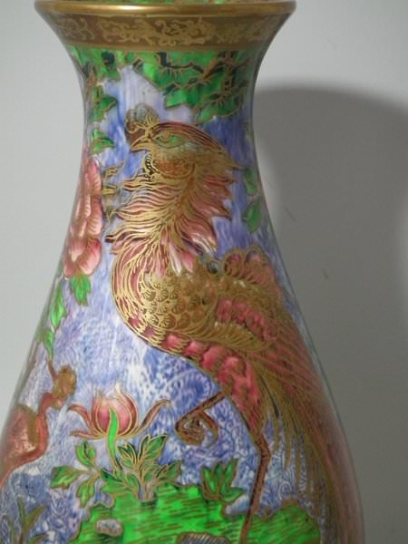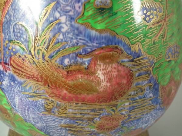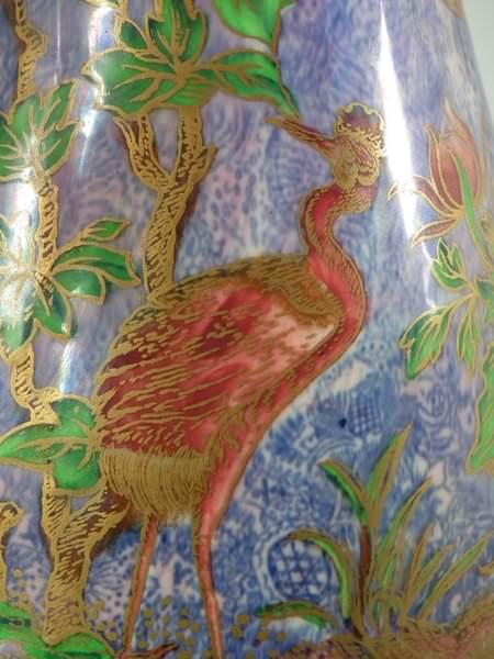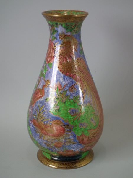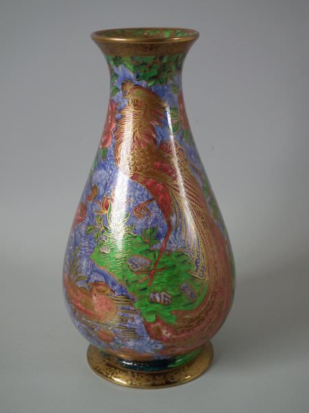 Circa 1930. 12ins high, 6ins diameter. Wedgwood lustre vase decorated with the Argus Pheasant pattern, on blue lustre ground.