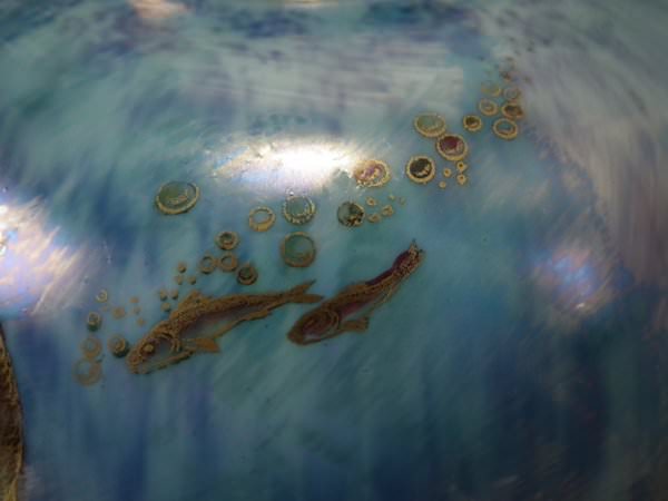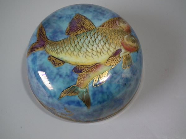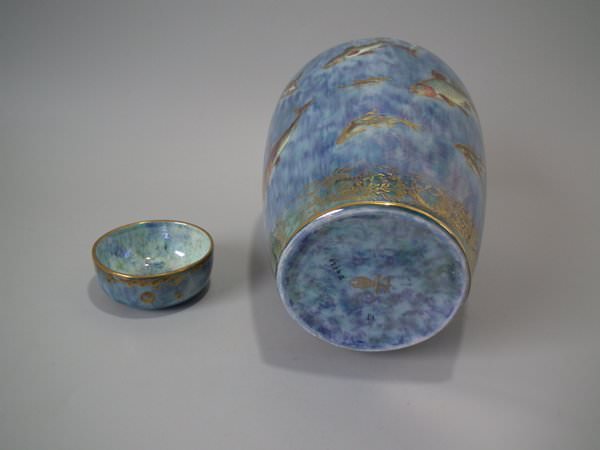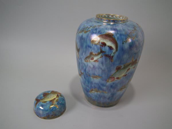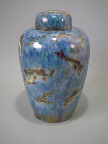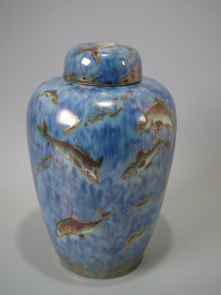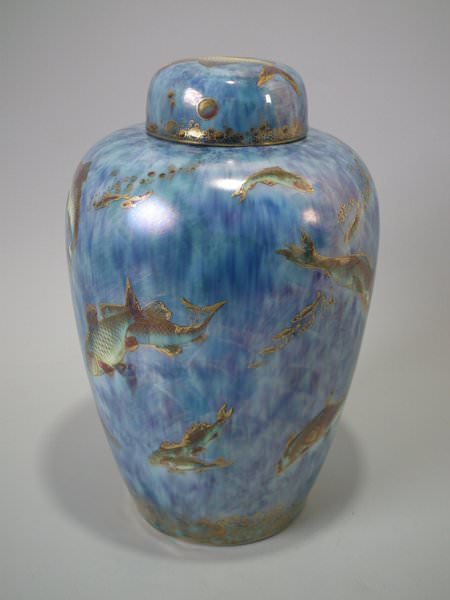 Circa 1920. 9.5ins high 6ins wide. Wedgwood fish lustre Malfrey pot, shape number 2311. Mottled blue exterior decorated with fish. Mother of Pearl ground to interior.