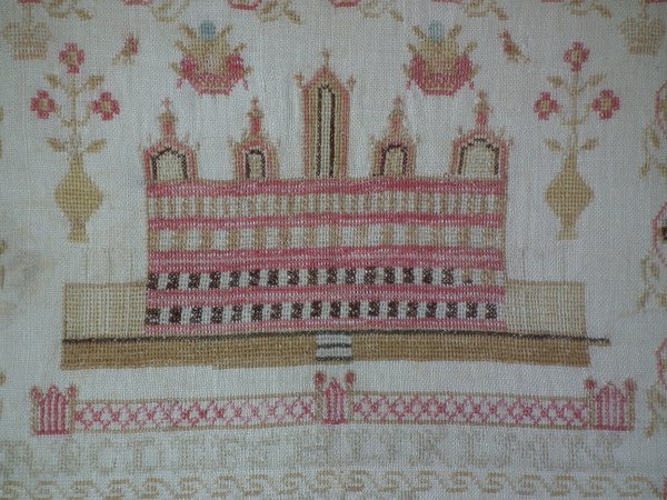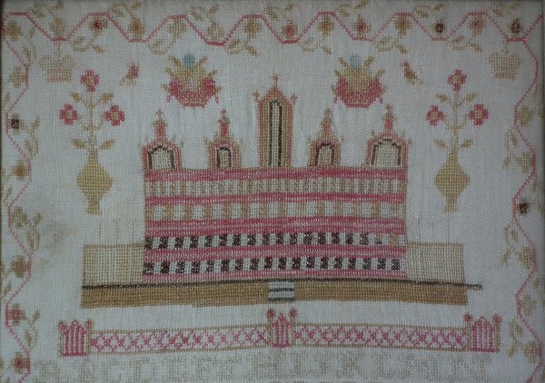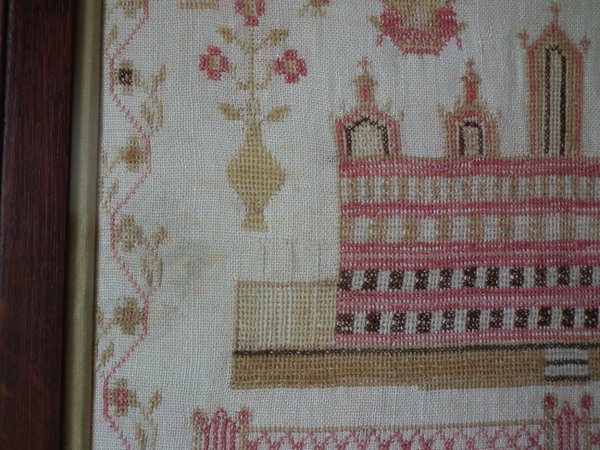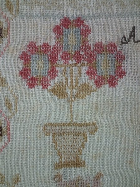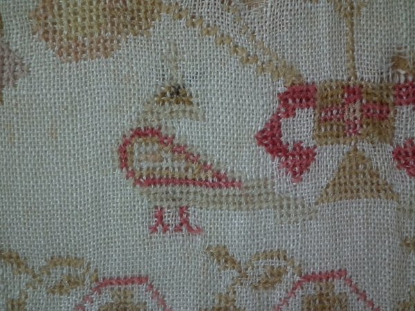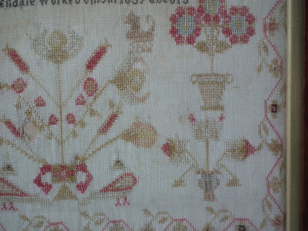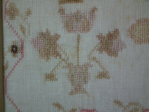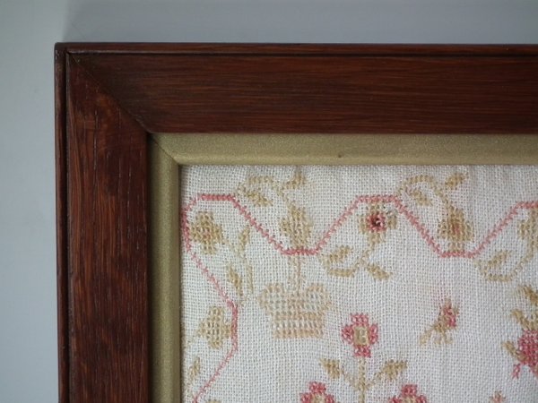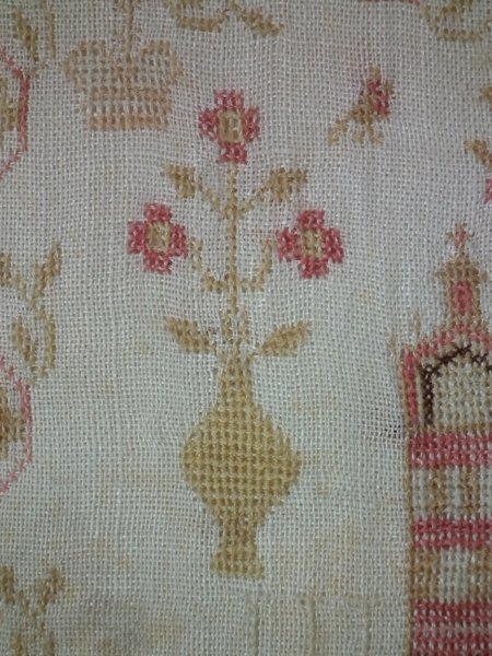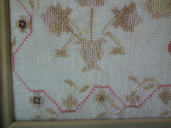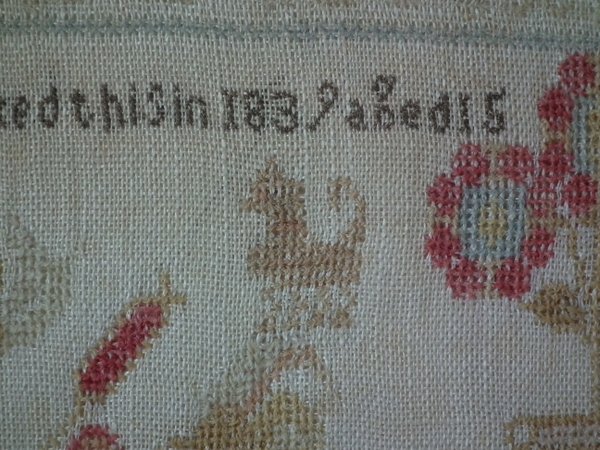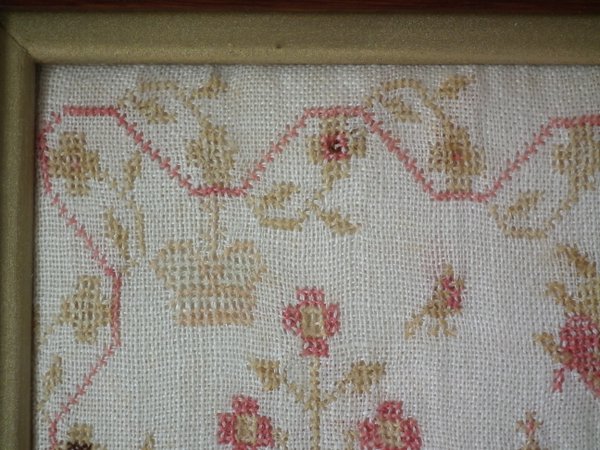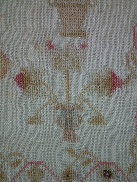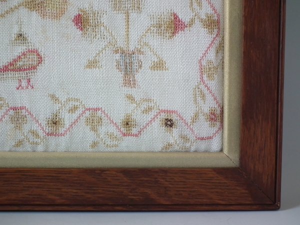 The sampler is worked in fine wool on linen ground, in cross stitch throughout.