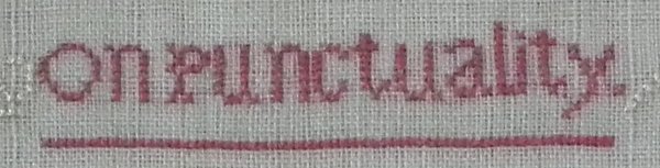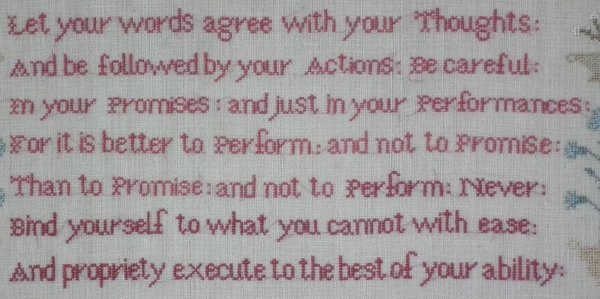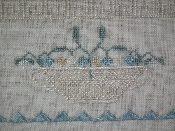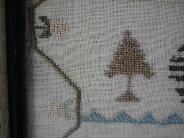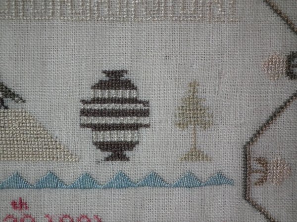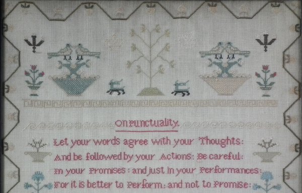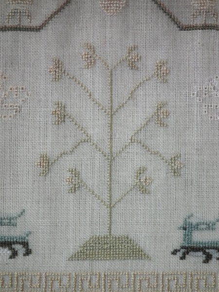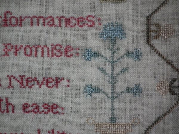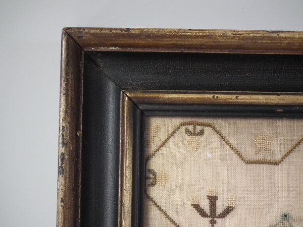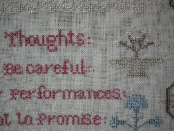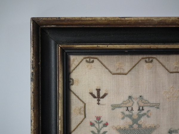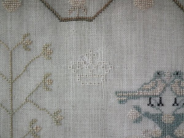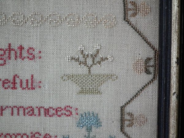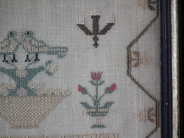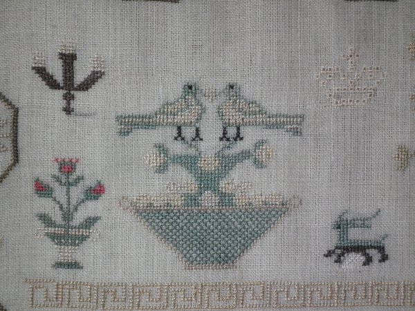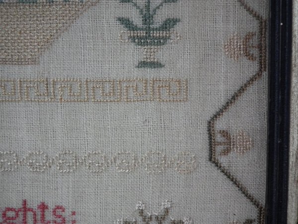 The sampler is worked in silk on linen ground, in a variety of stitches.