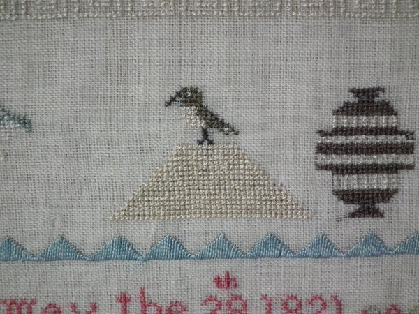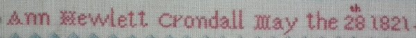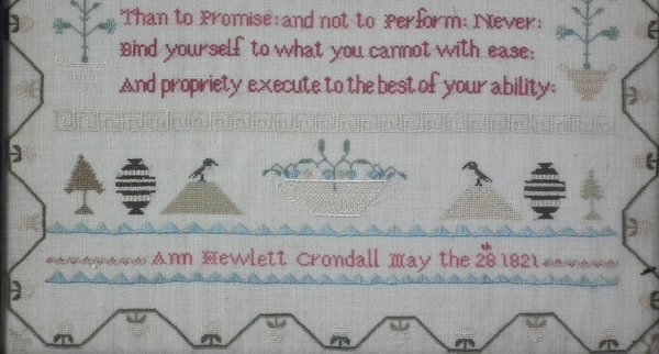 George IV, dated 1821. 14.75ins by 12.5ins wide. 1821 Sampler by Ann Hewlett Crondall.