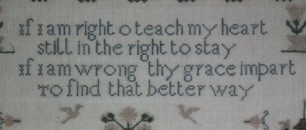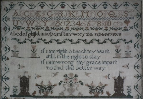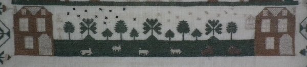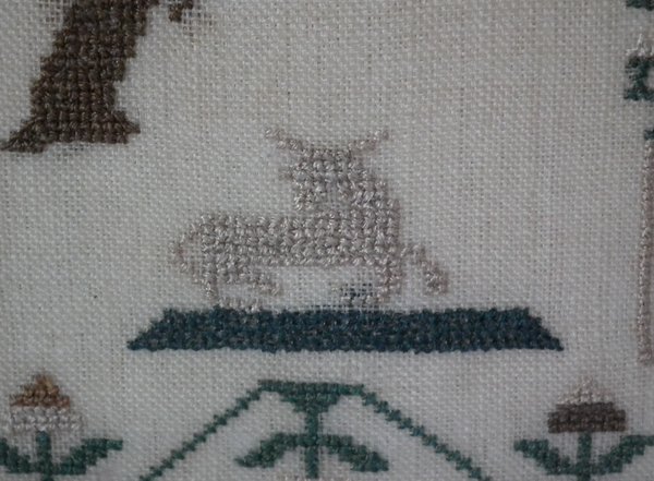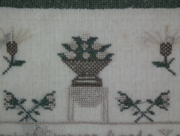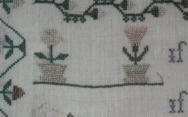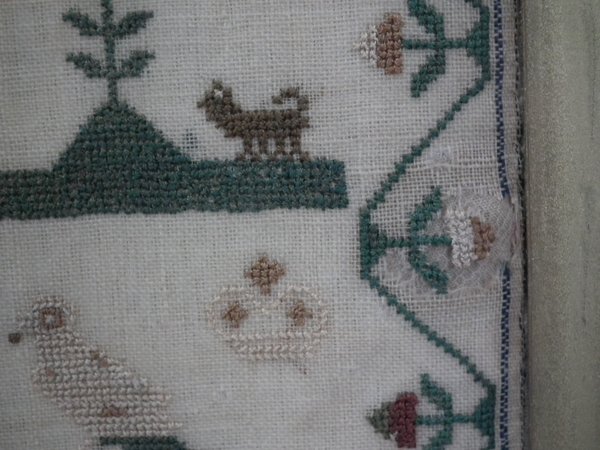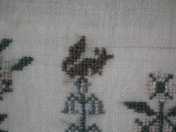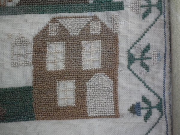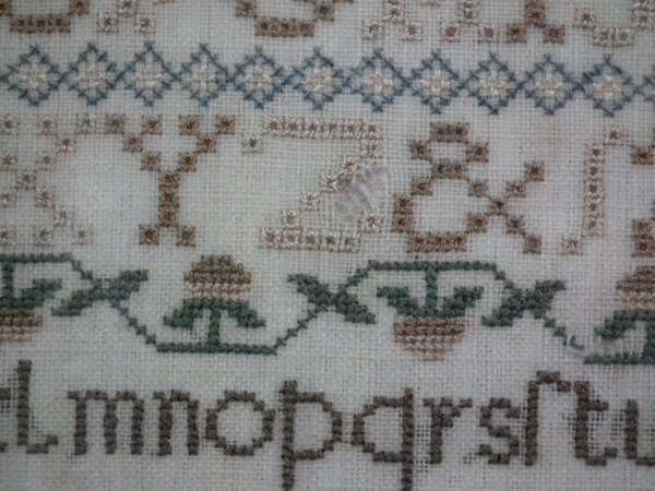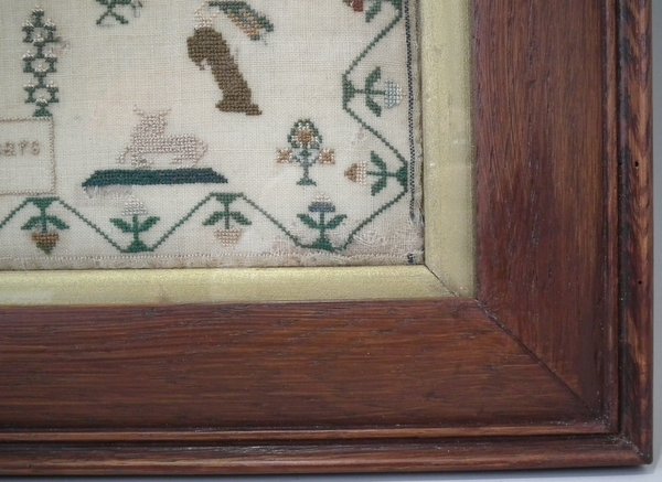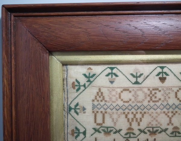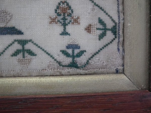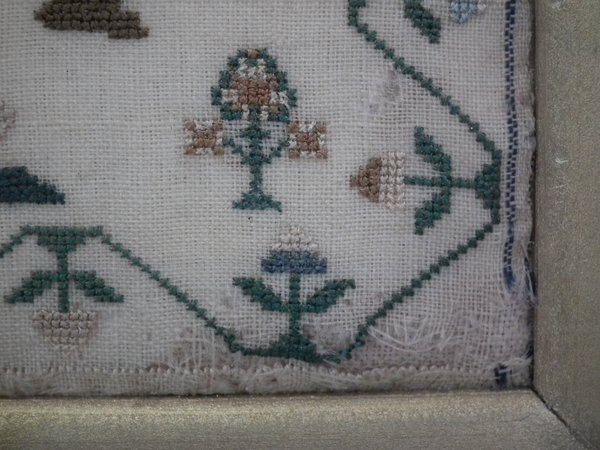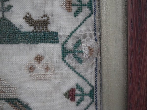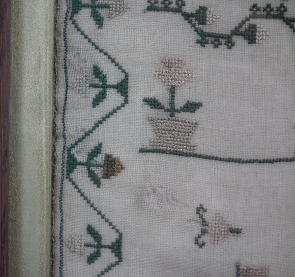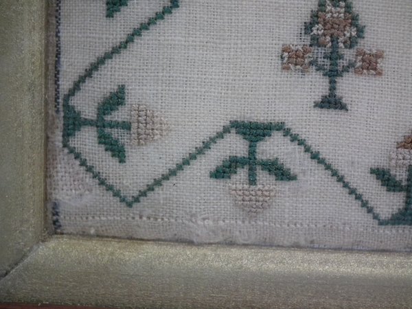 The sampler is worked in silk on linen ground, in cross stitch and Algerian eye. Meandering strawberry border.