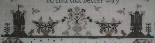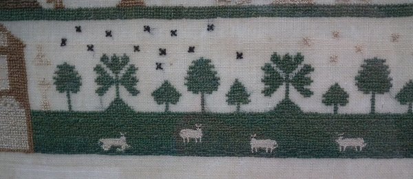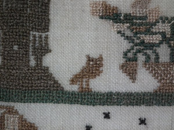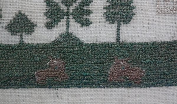 A good set of motifs, some finely detailed, including two houses with a field containing sheep and deer between them, lions, dogs, birds, flowers, insects, potted flowering plants, fruit baskets, squirrels, crowns, hearts, two follies flying a flag and owls.