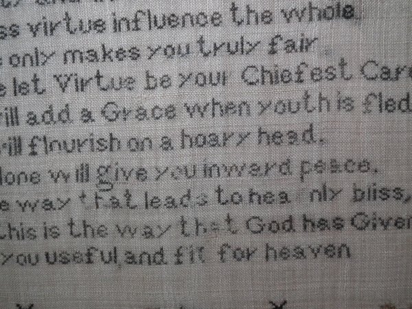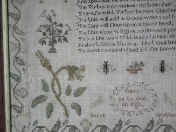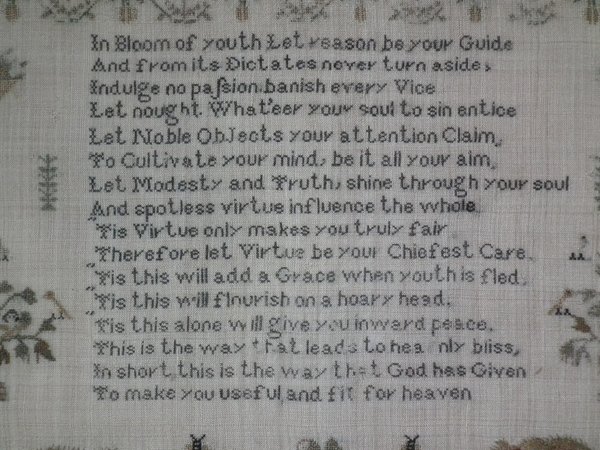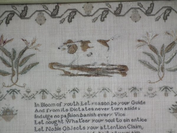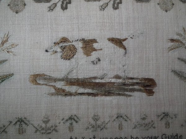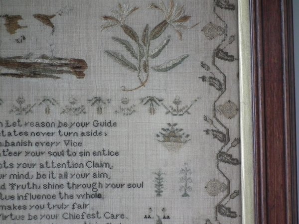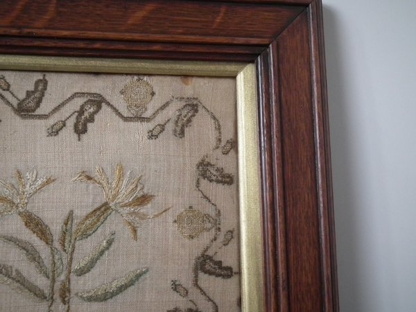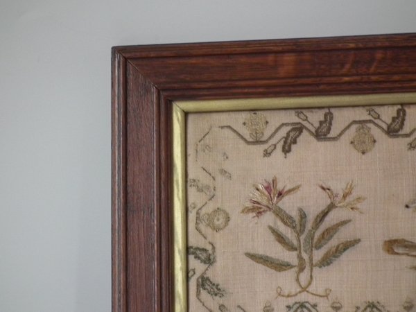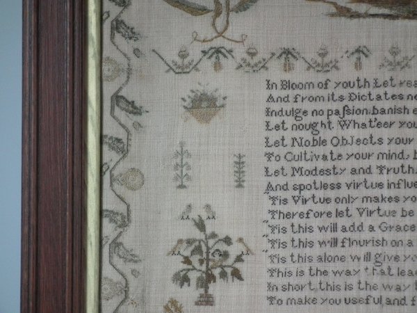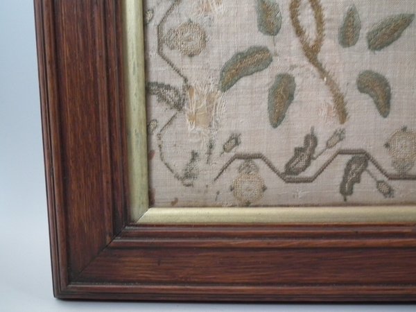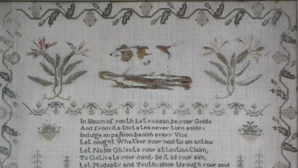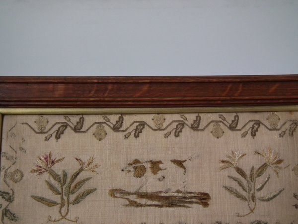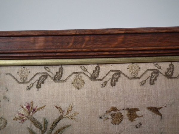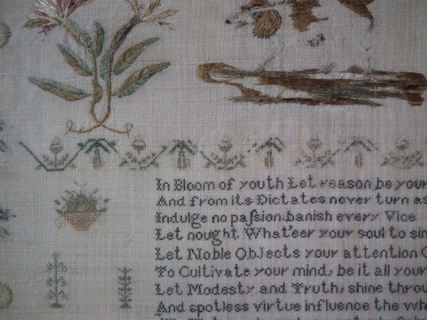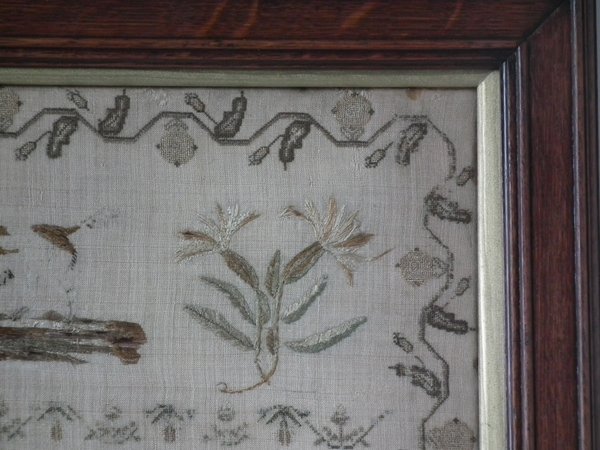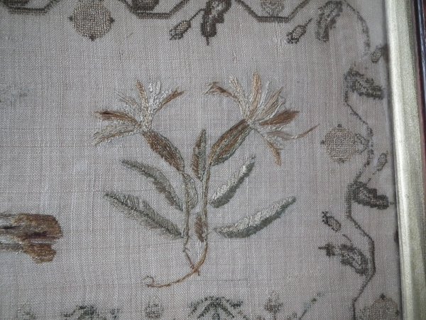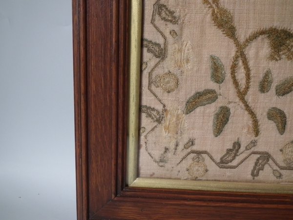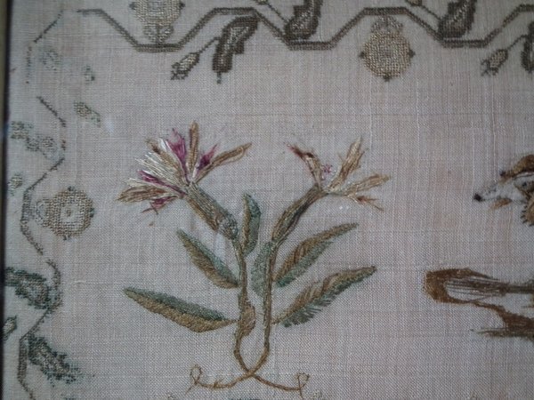 The sampler is worked in silk on linen ground, in a variety of stitches.