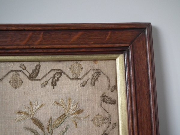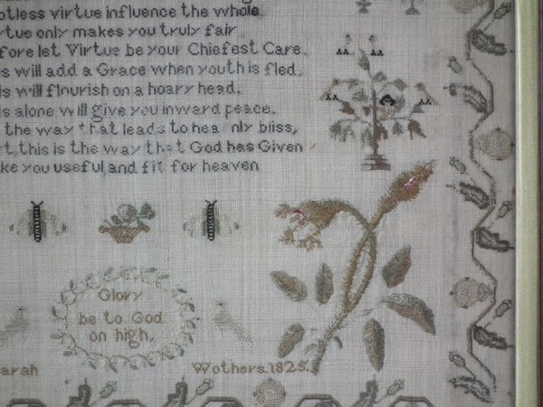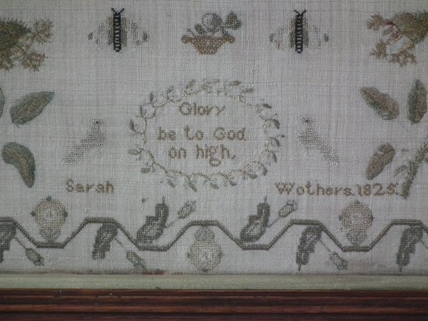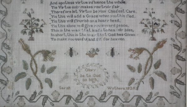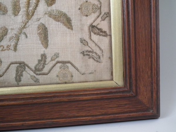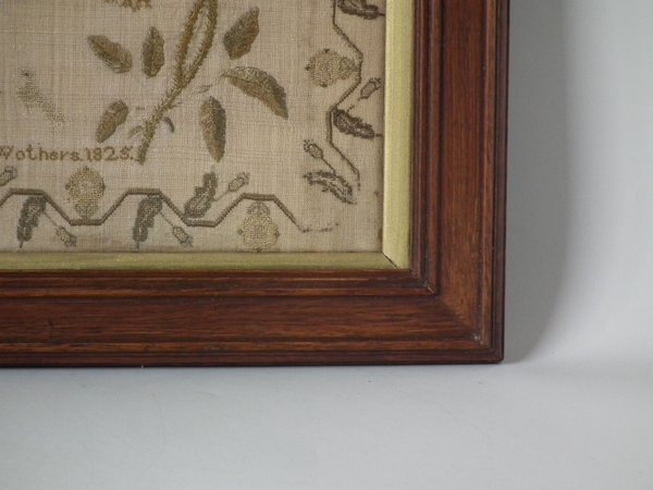 George IV, dated 1825. 20.5ins by 18ins wide. 1825 Sampler by Sarah Wothers. Framed in a Victorian oak frame with gilt slip and glass.