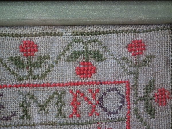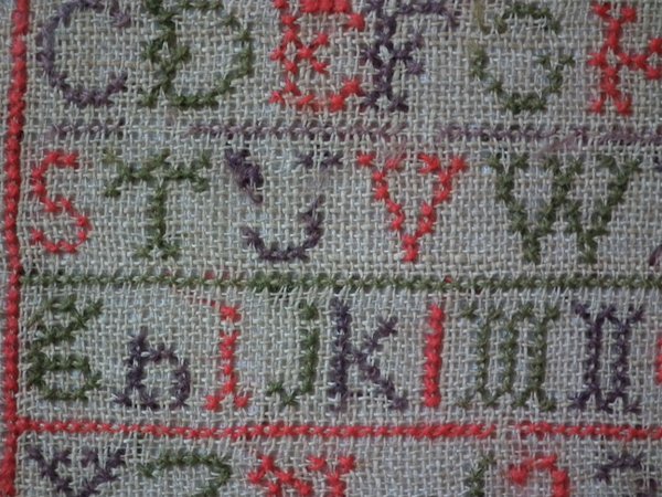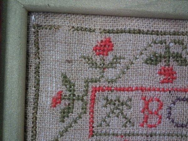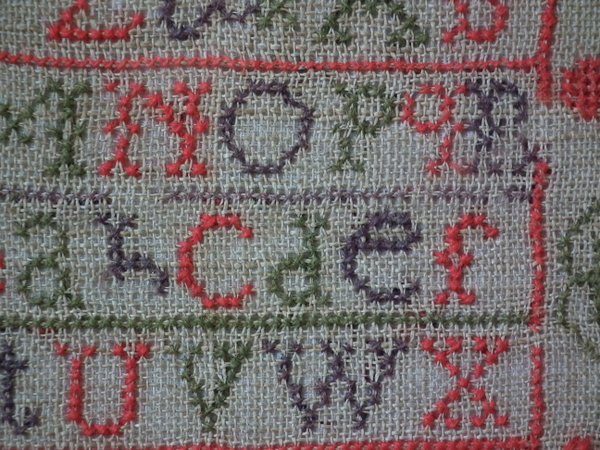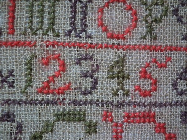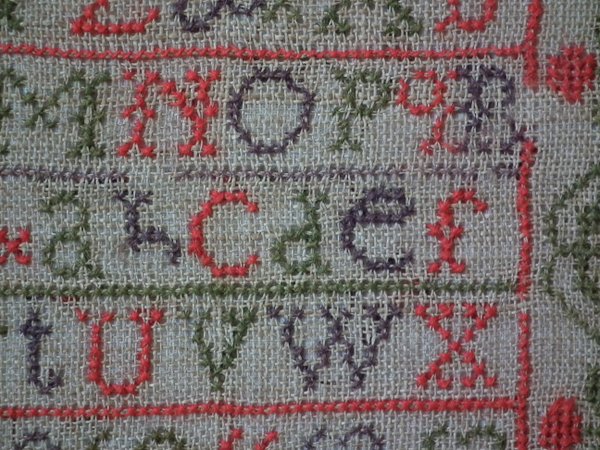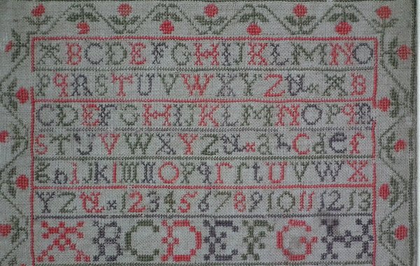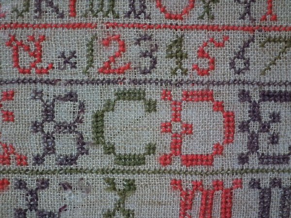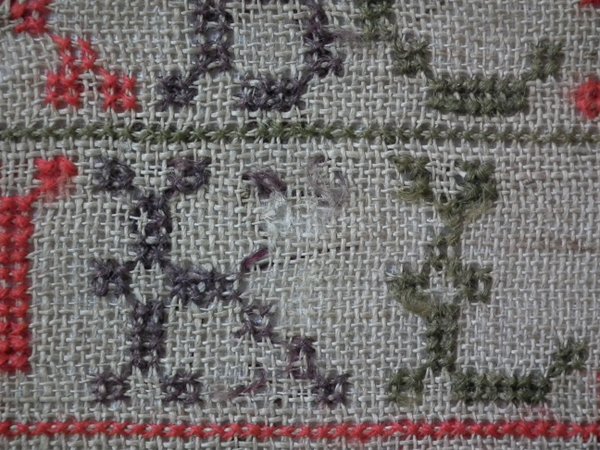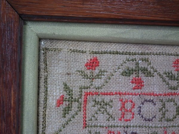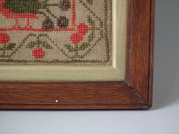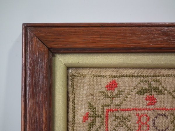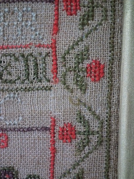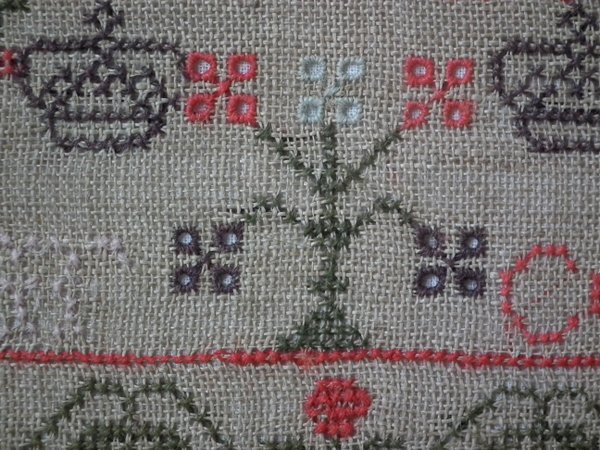The sampler is worked in wool and silk on canvas ground, in cross stitch and Algerian eye.