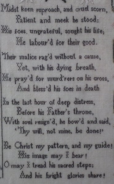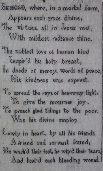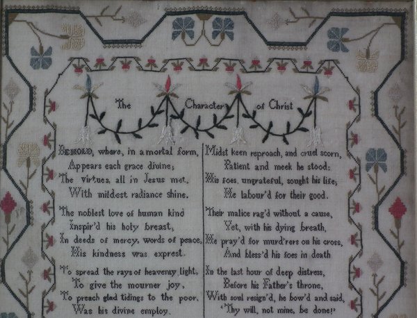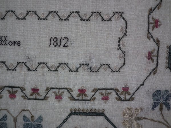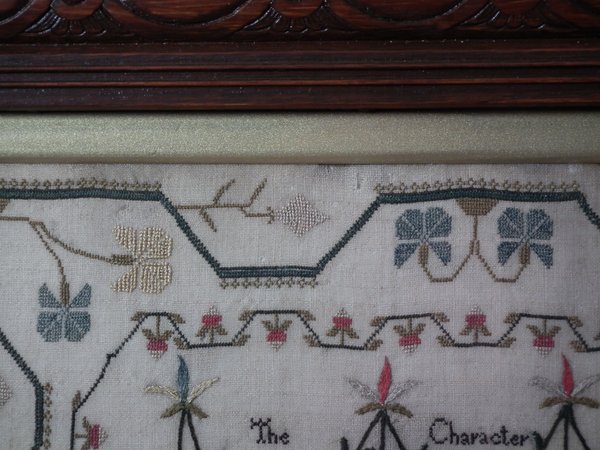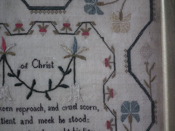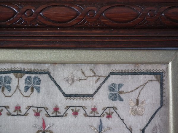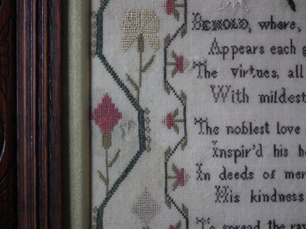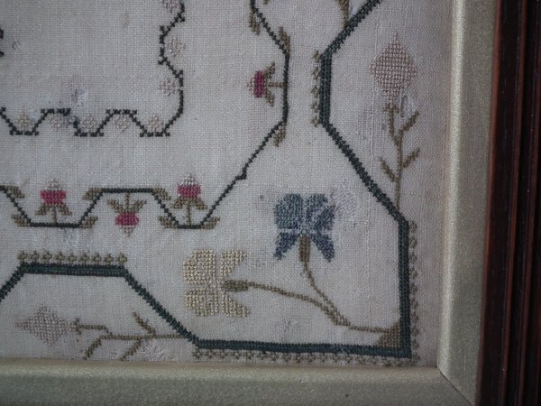 The sampler is worked in silk on linen ground, in a variety of stitches.