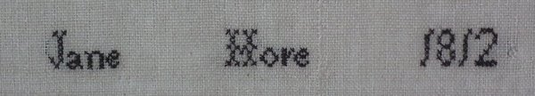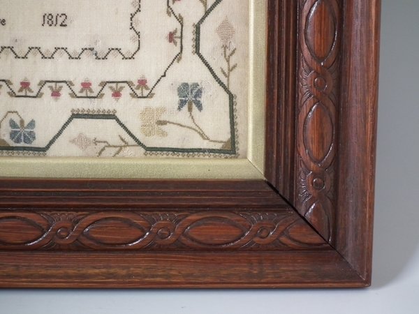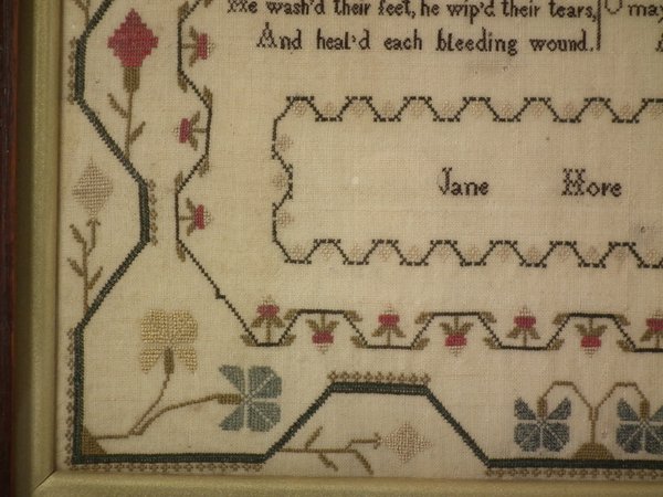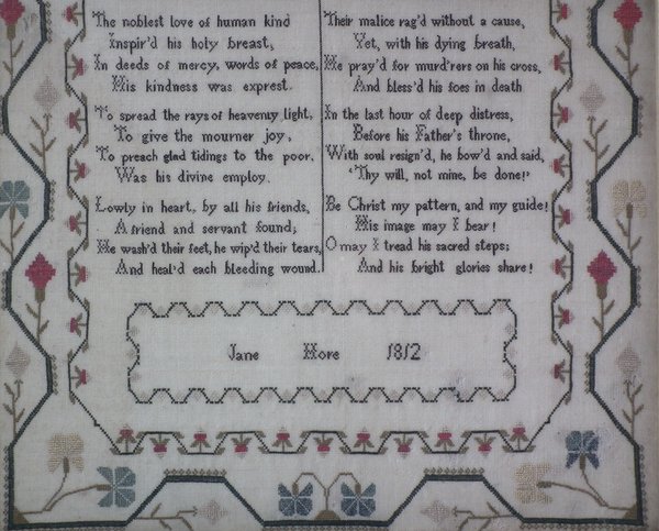 1812 Religious verse Sampler by Jane Hore. Framed in an old wood frame with gilt slip and glass.