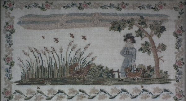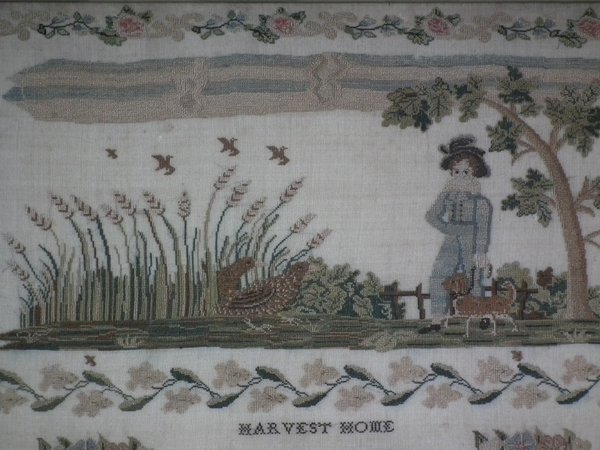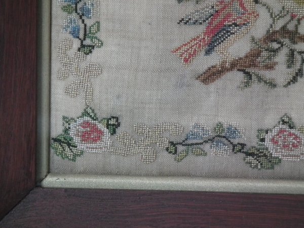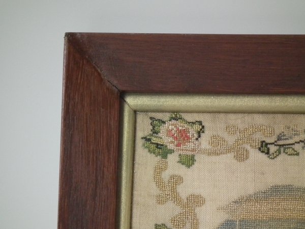 William IV, dated 1836. 20.25ins by 18.75ins wide. 1836 Sampler by Harriet Carter. Framed in an old wood frame with gilt slip and glass.