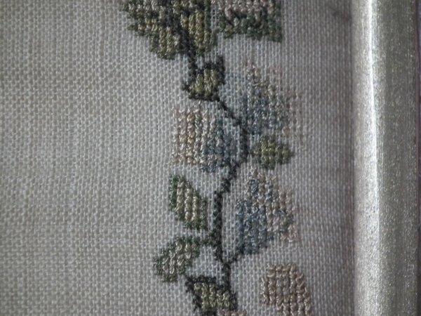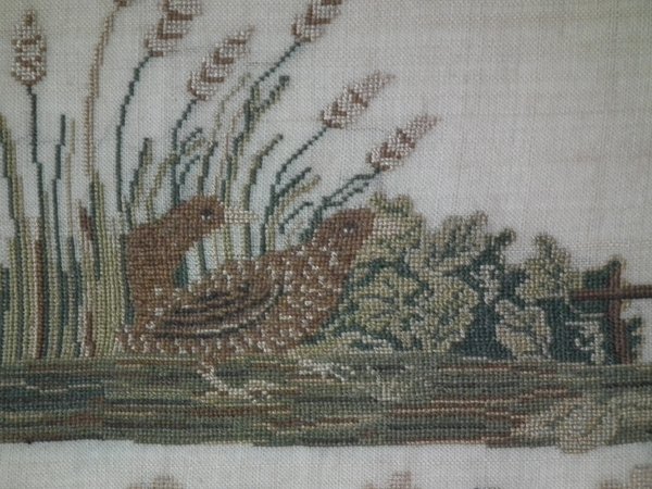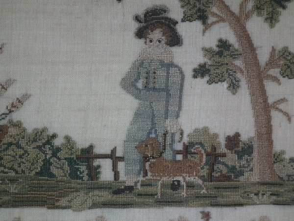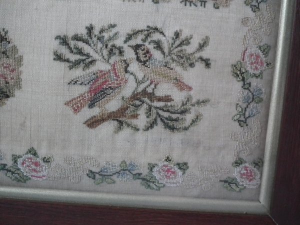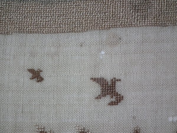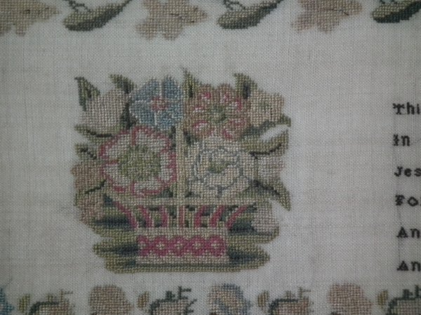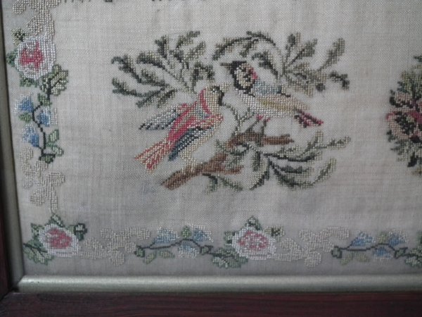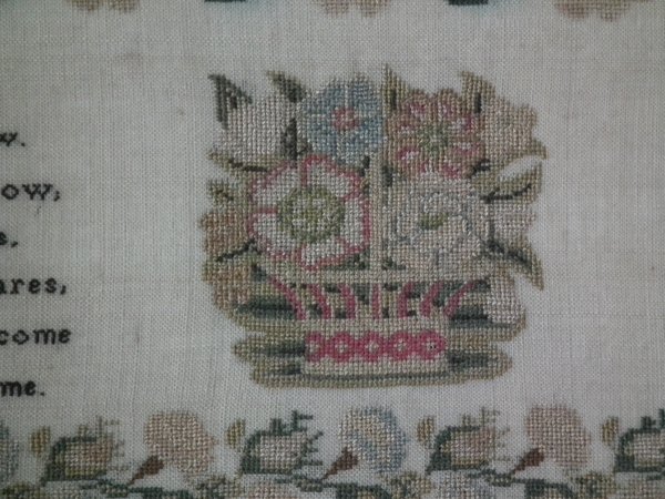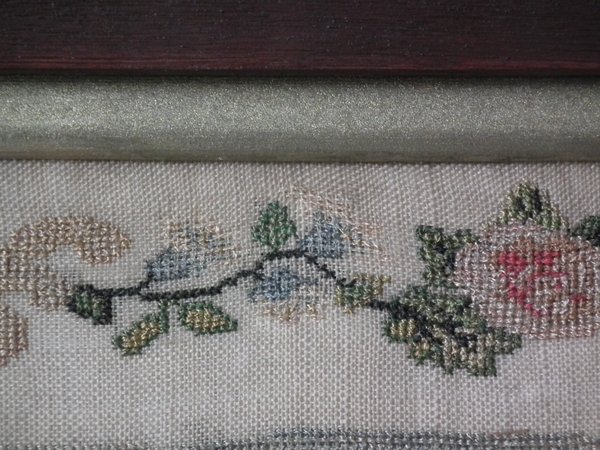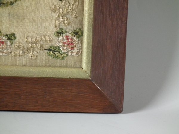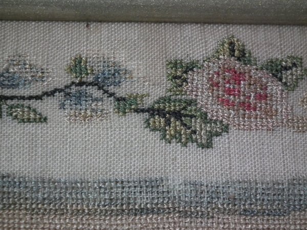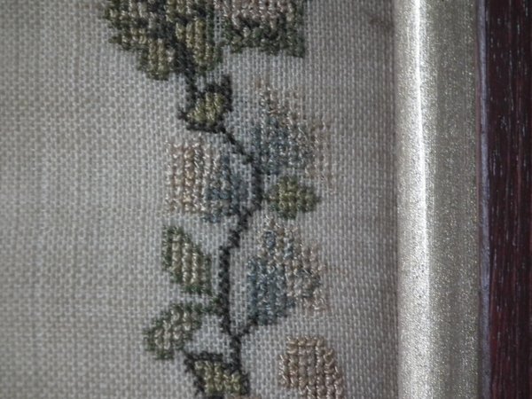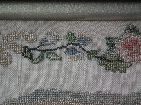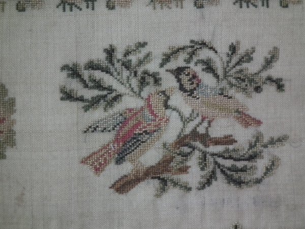 The sampler is worked in silk on linen ground, in cross stitch throughout.
