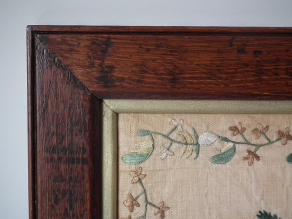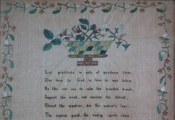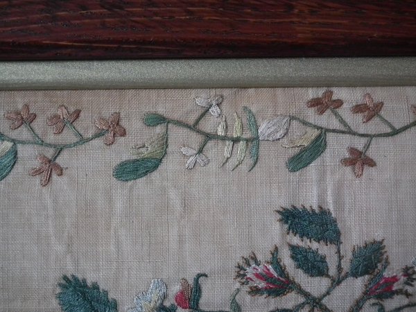 The sampler is worked in silk on linen ground, in a variety of stitches.