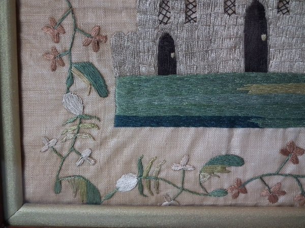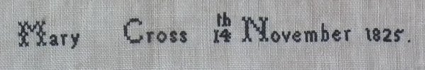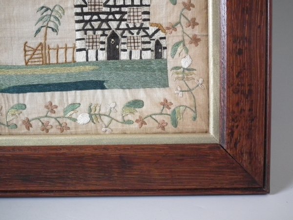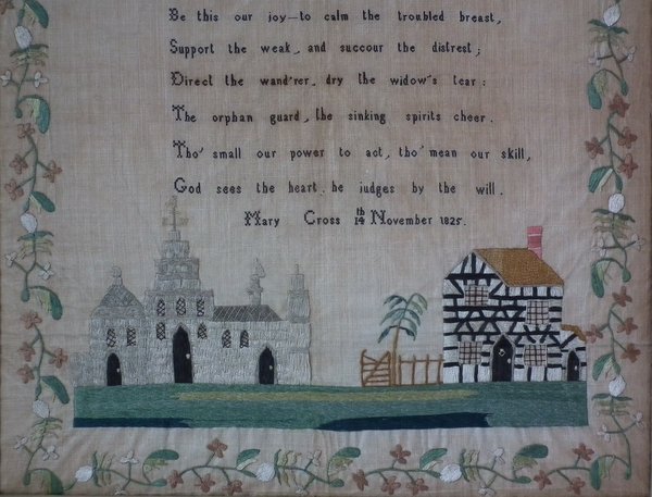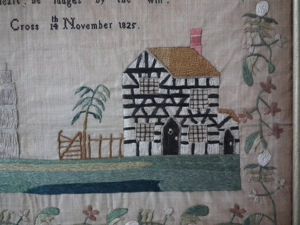 George IV, dated 1825. 18.5ins high by 14.5ins wide. 1825 'Tudor house' Sampler by Mary Cross. Framed in an old wood frame with glass.