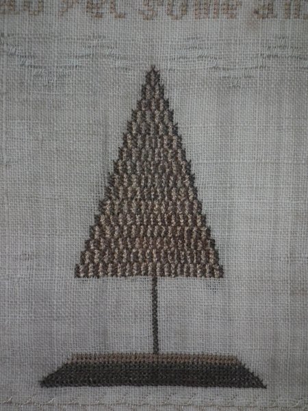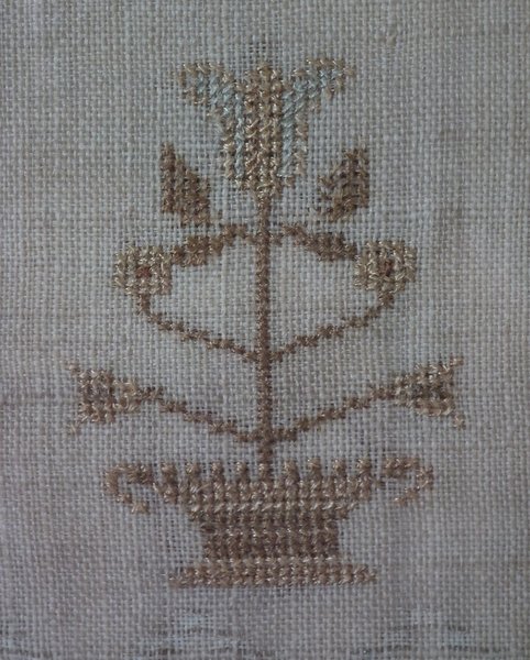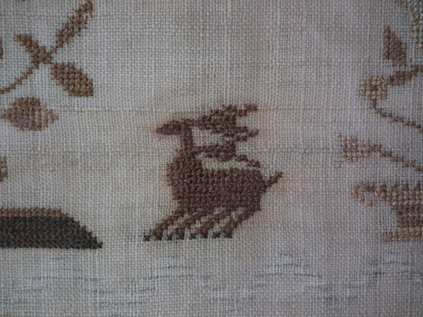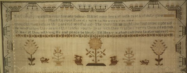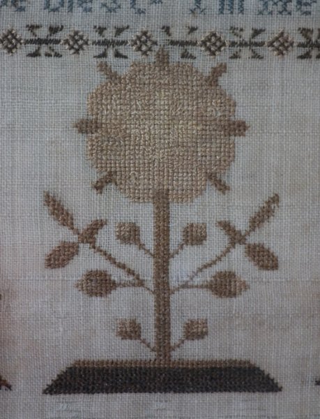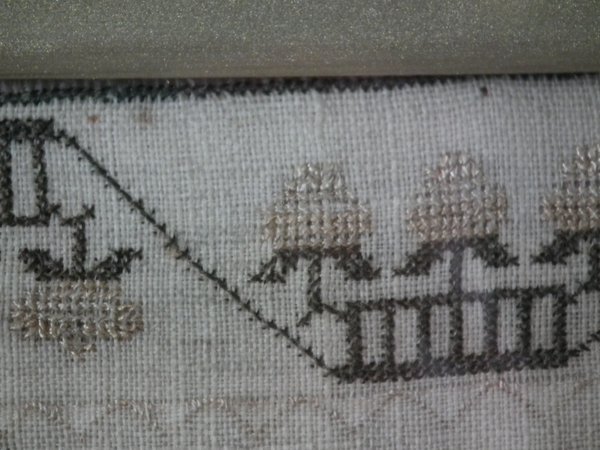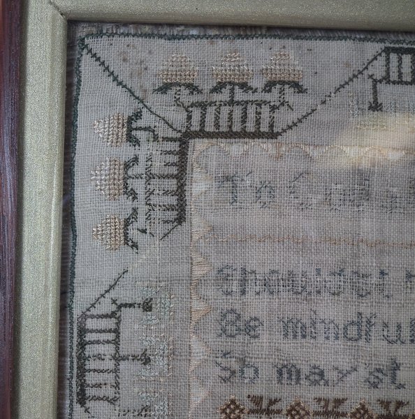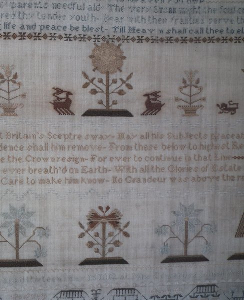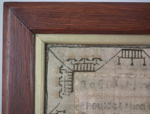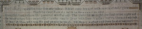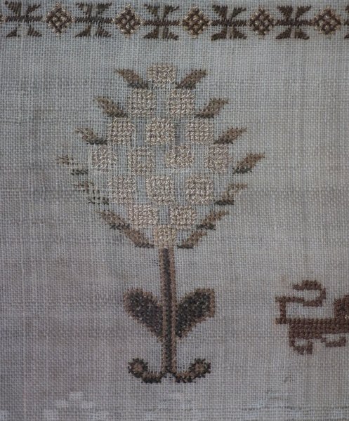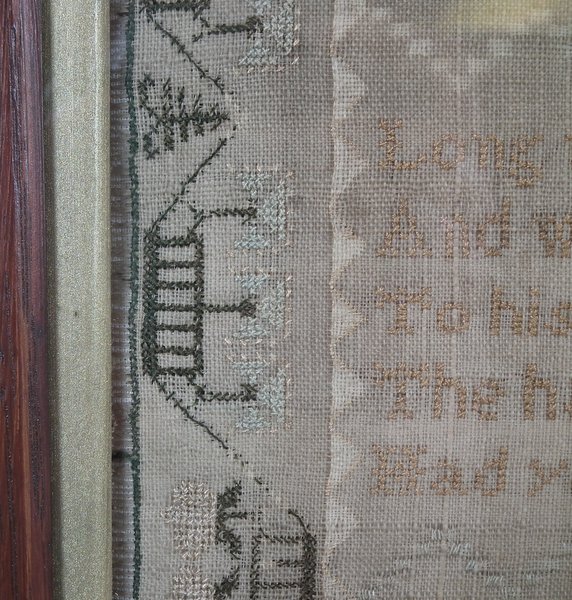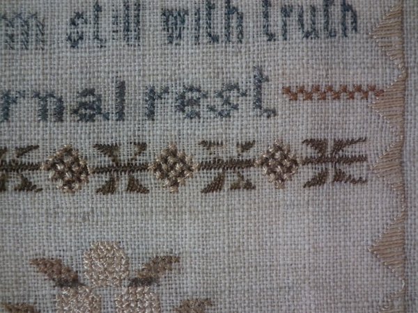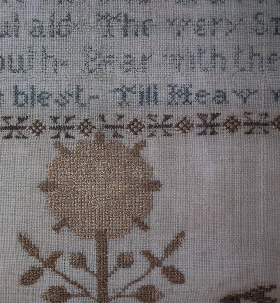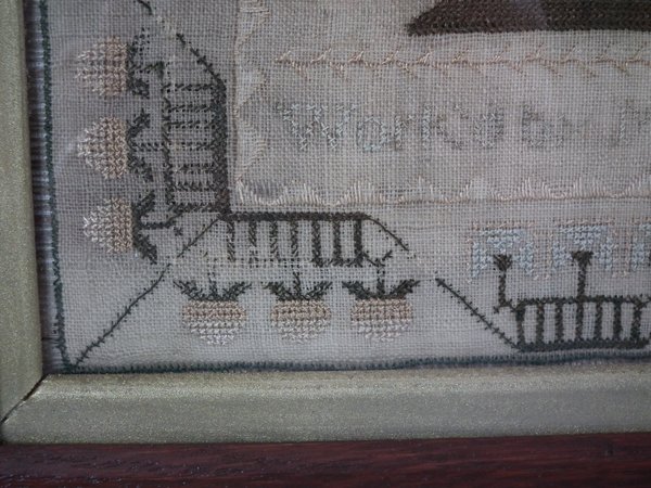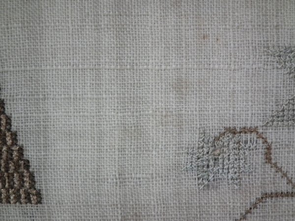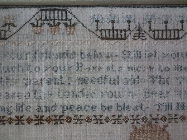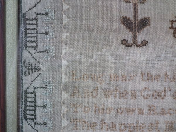 The sampler is worked in silk on linen ground, in a variety of stitches.