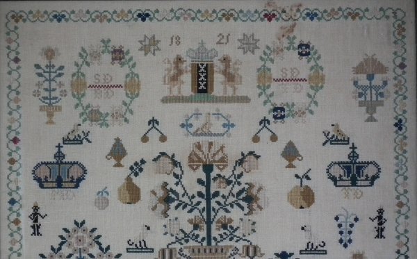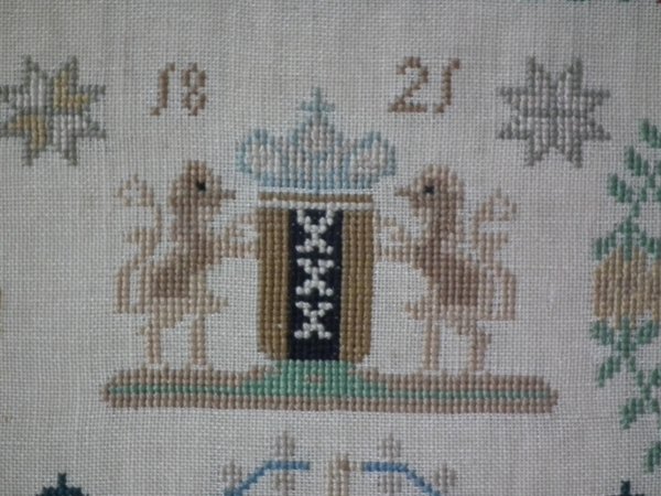 1821 Dutch, Amsterdam Sampler. Framed in a modern wood frame with glass.