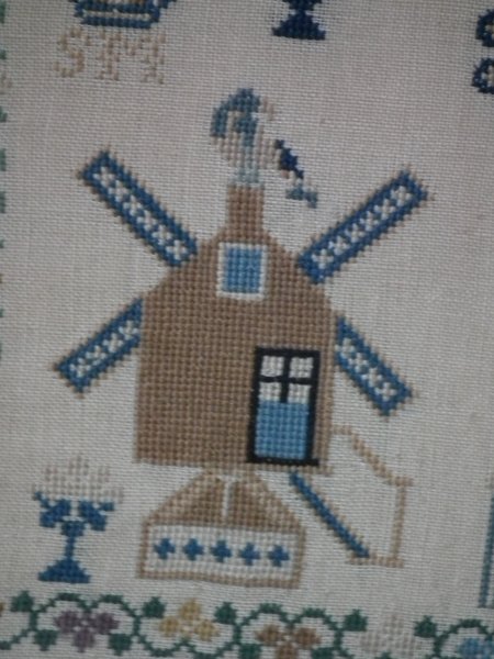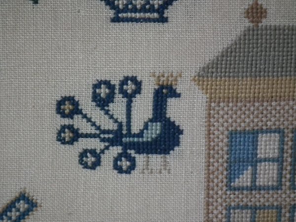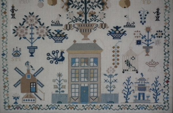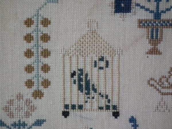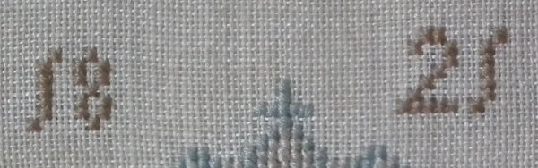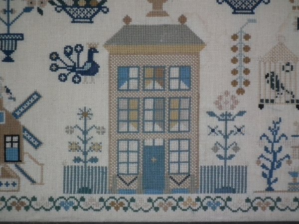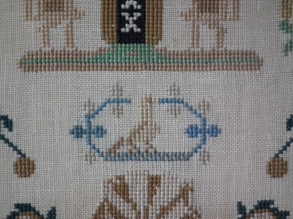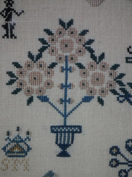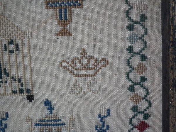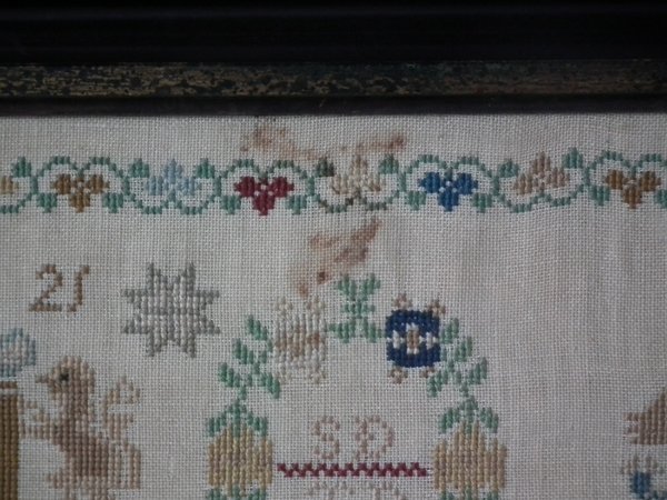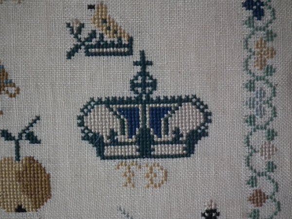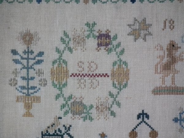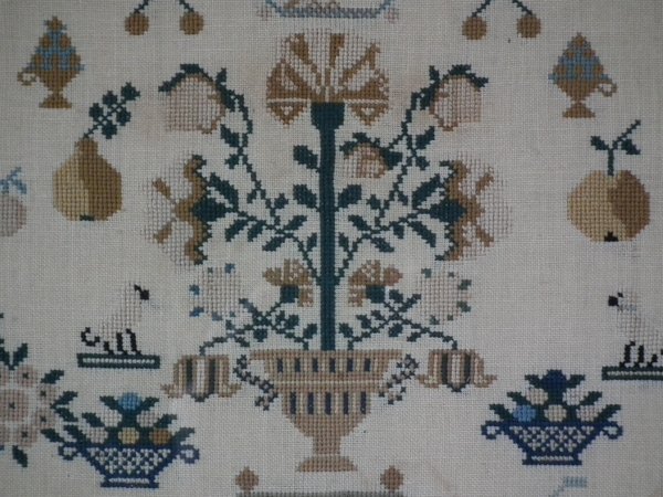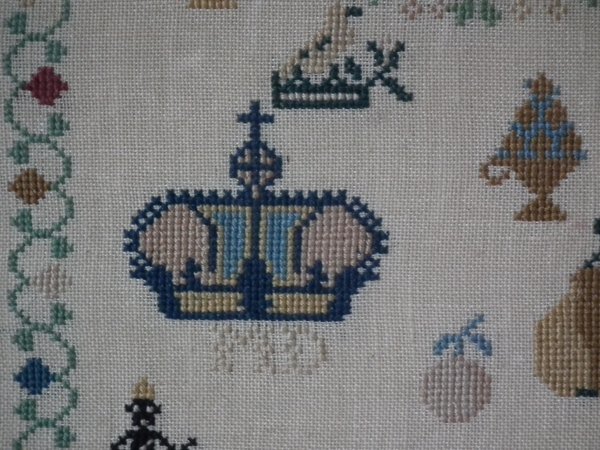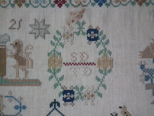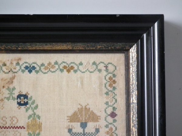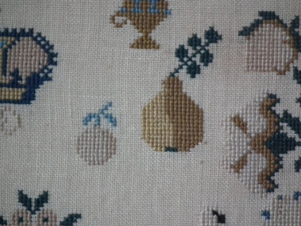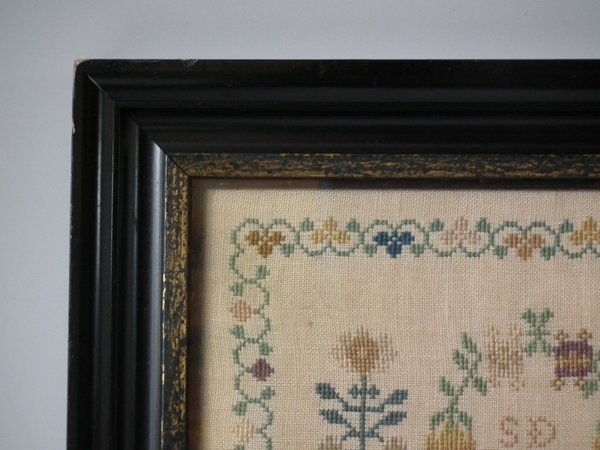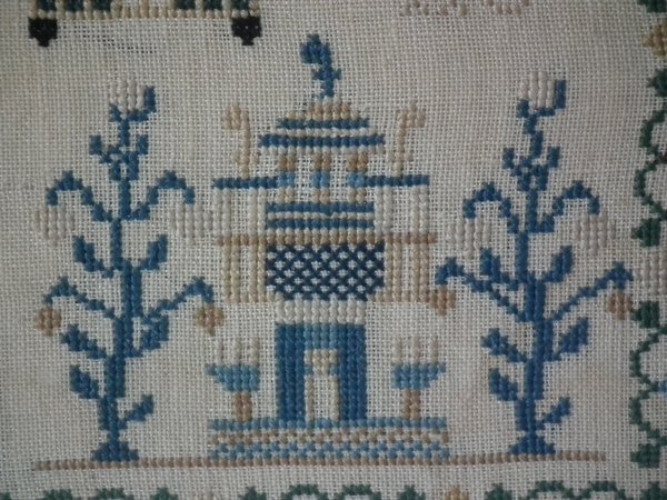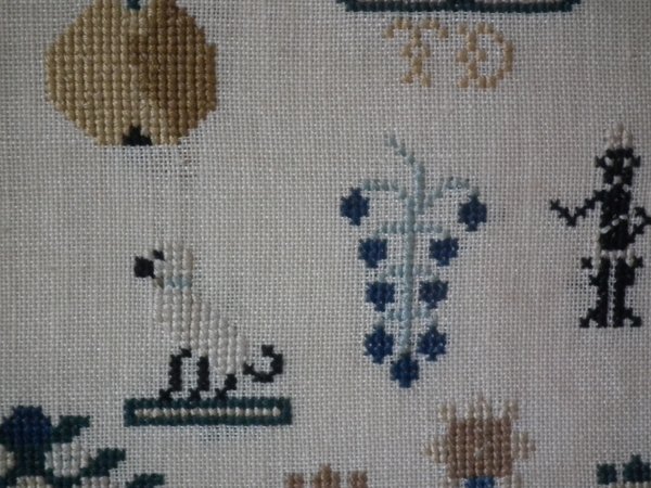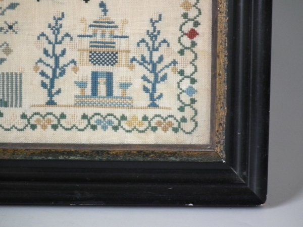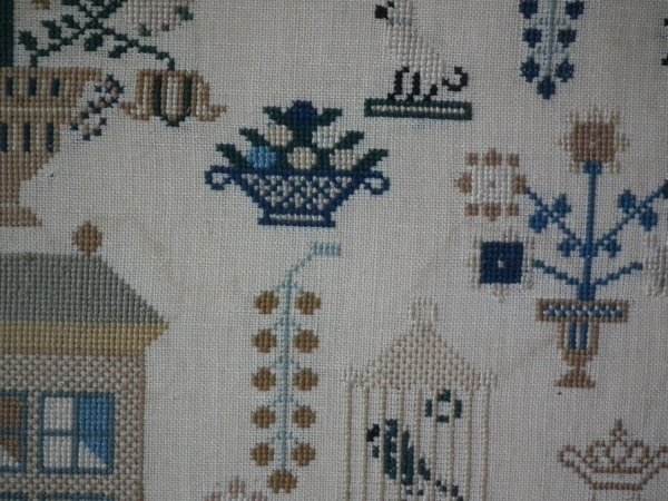 The sampler is worked in silk on linen ground, in cross stitch throughout.